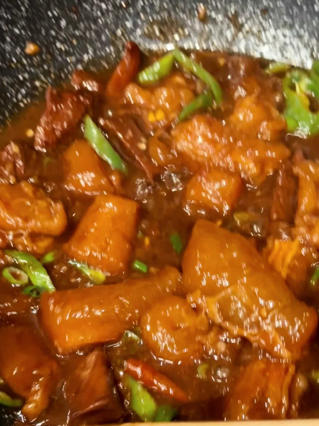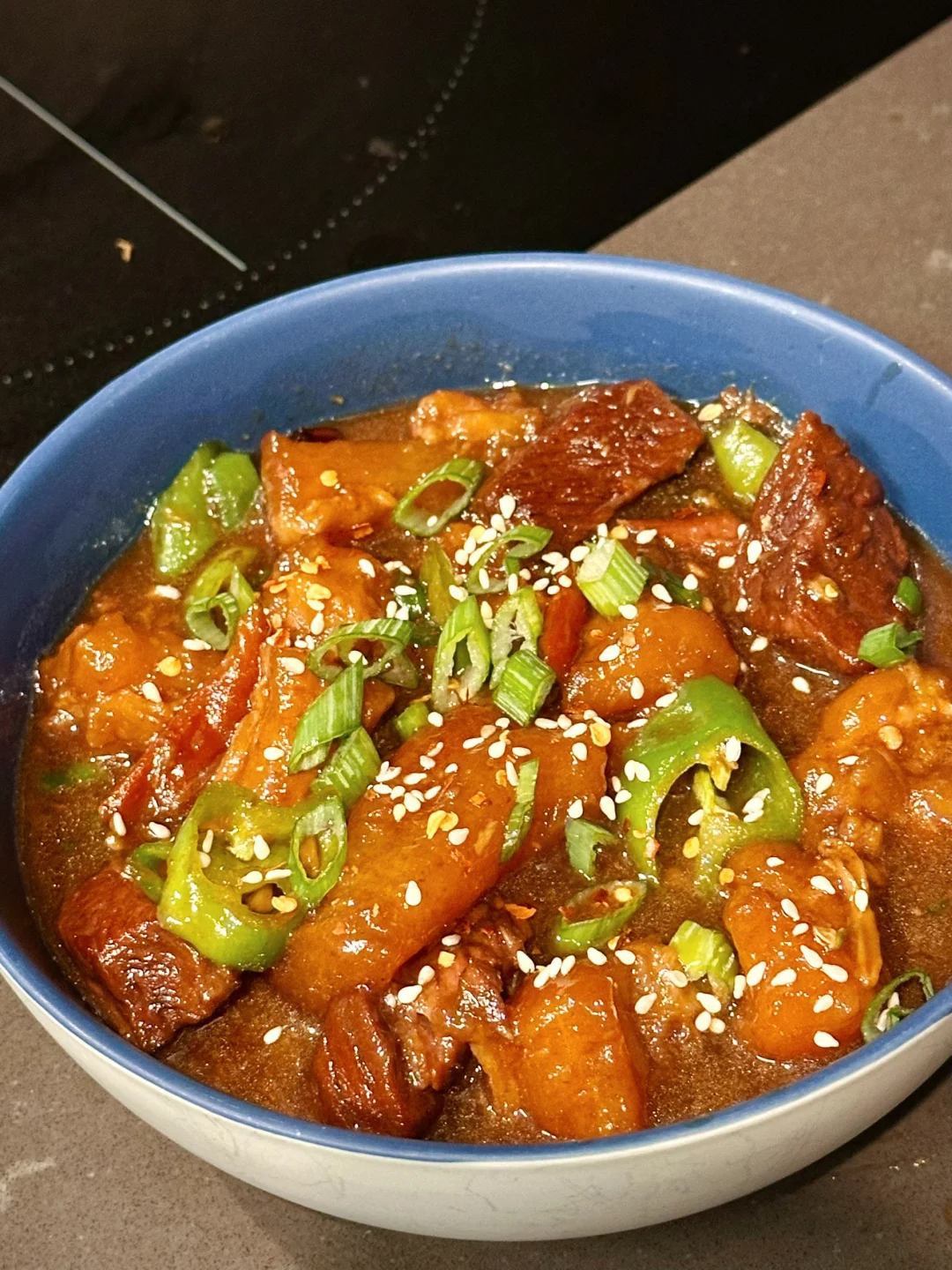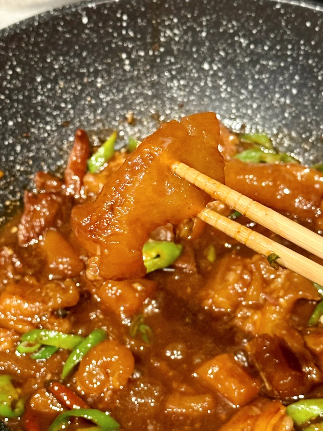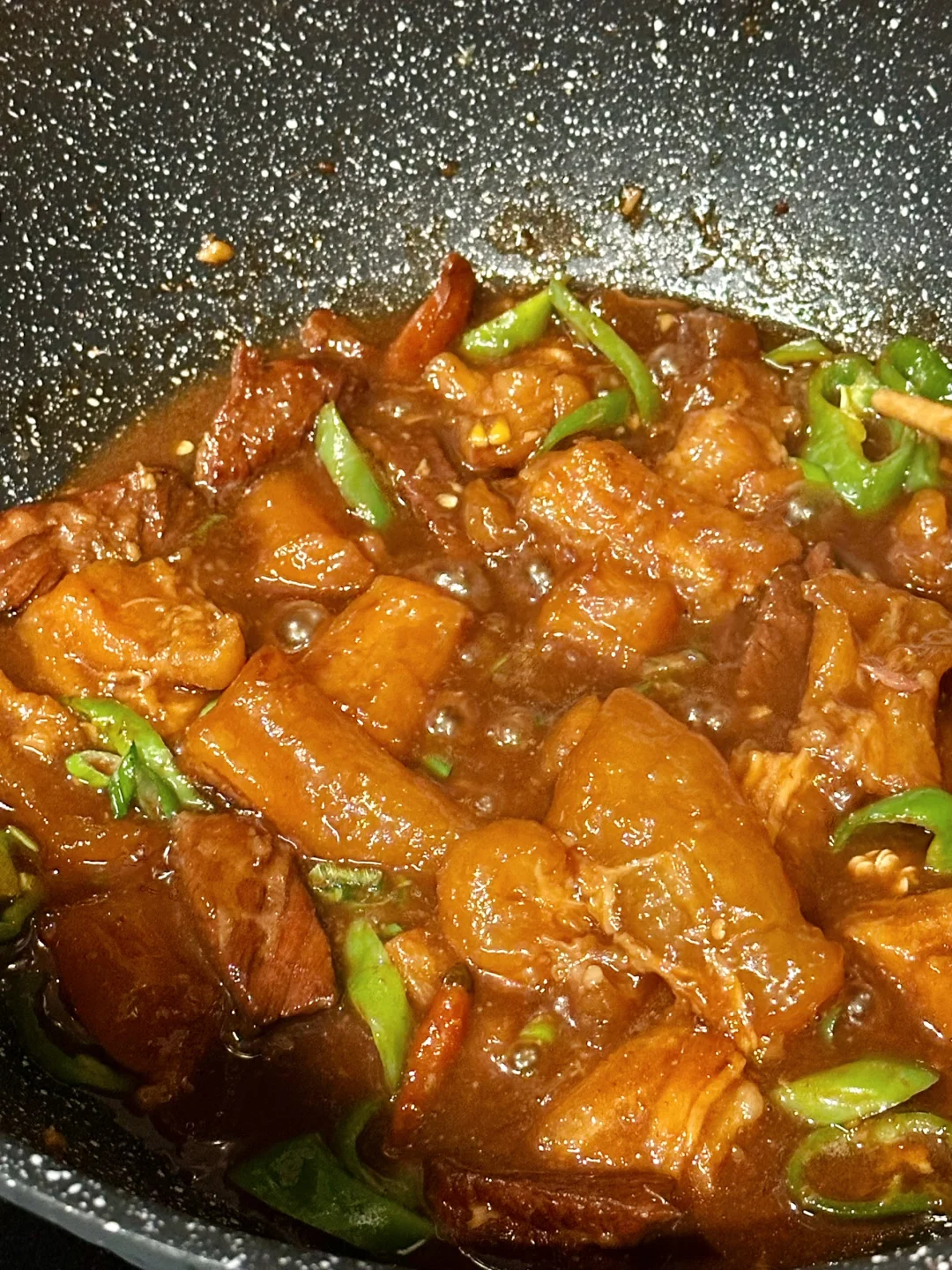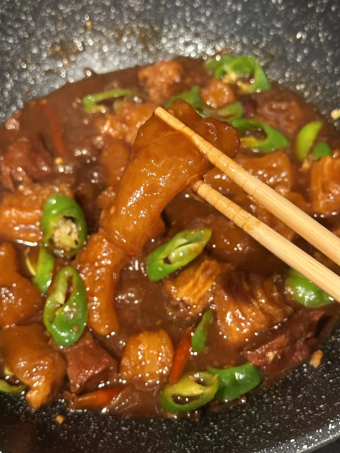 最后十分钟放辣椒块增香,并且大火收汁,这时候需要勤翻拌,因为牛筋质地比较容易粘锅,然后就完成啦!