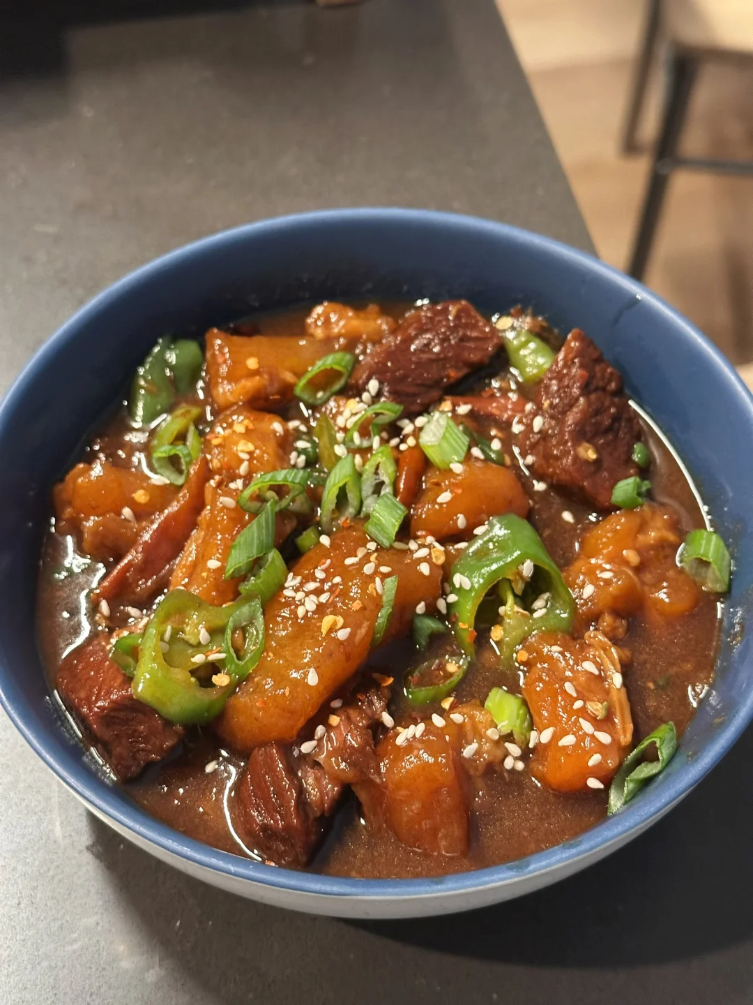 强烈推荐试试这个牛筋牛腩煲!看到大块的牛筋从一开始倔强硬实的状态慢慢炖成软乎的半透明,真的超有成就感。用筷子夹起调皮的一块,赶快送入口中,耙糯到有些粘嘴,胶质感满满。浓郁的酱香和啤酒香,带一点爽快的辣意,汤汁和牛腩甚至有点康师傅牛肉面的感觉!