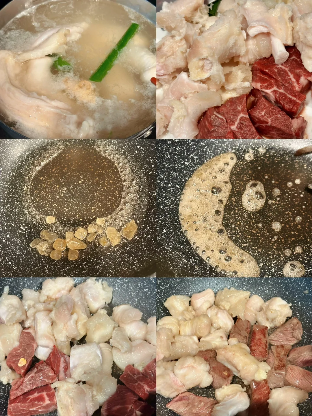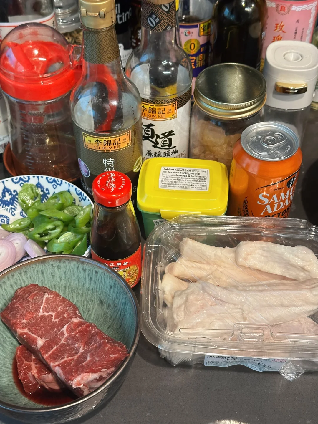 牛筋一盒(beef tendon),牛腩一条(我用的short ribs),葱姜,料酒,食用油1tbsp,冰糖一小把,清水适量,蒜两瓣,花椒一小把,八角一个,香叶一片,红葱头/洋葱适量,干辣椒三四个,生抽2tbsp,老抽1tbsp,蚝油1tbsp,黄豆酱1tbsp,啤酒一罐,皱皮辣椒一个。