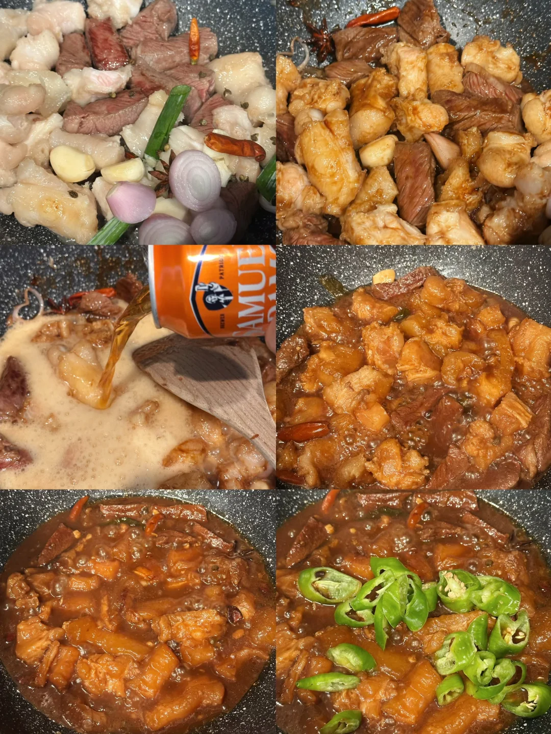 加入一罐啤酒和没过食材的清水,煮沸后转中小火煮,大概需要煮三小时,期间不怎么需要管,看有点干了搅拌下加水就好;