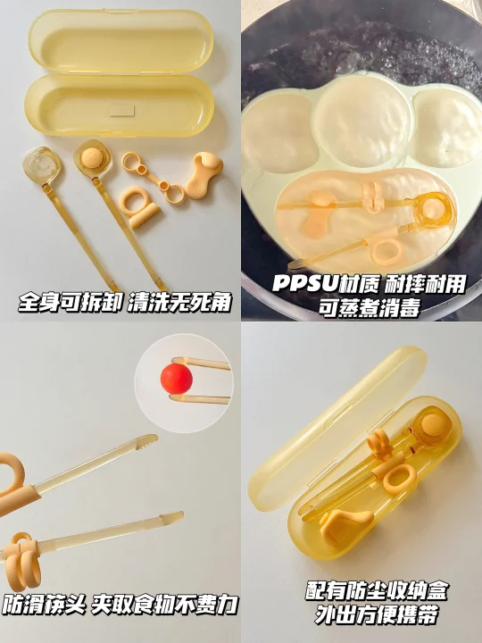 ✅搭配买的他们家的学习筷,也真的很不错~筷身是德国巴斯夫PPSU材质,平时高温蒸煮消毒都没事,而且很抗摔,筷头防滑设计,轻轻一夹食物就到手,特别好用!