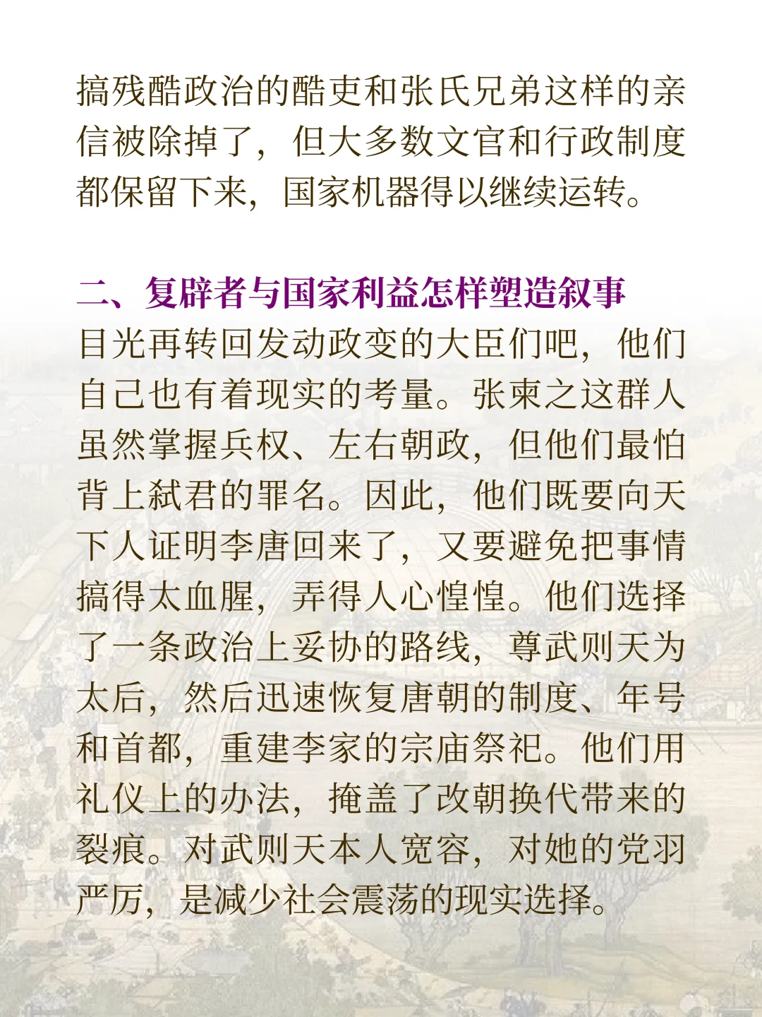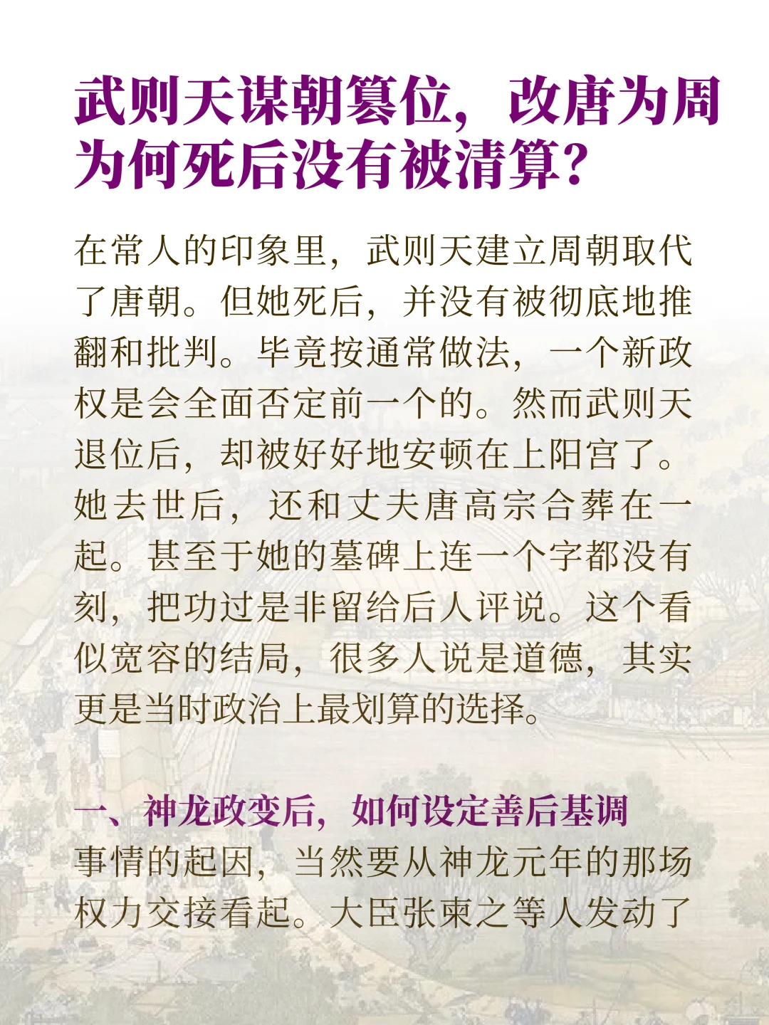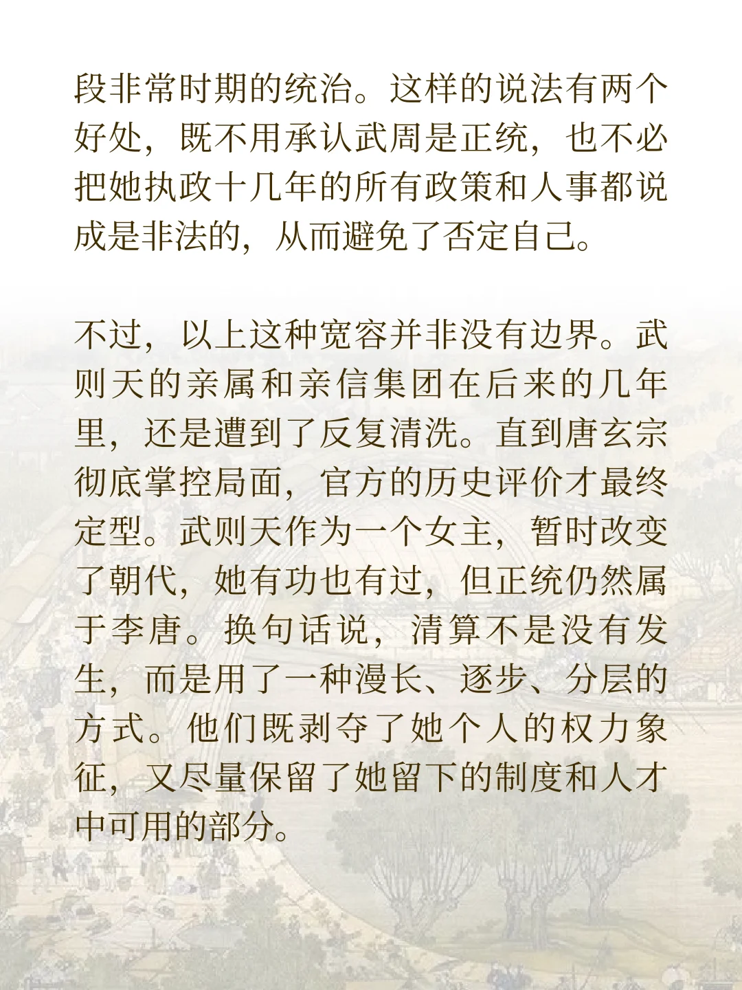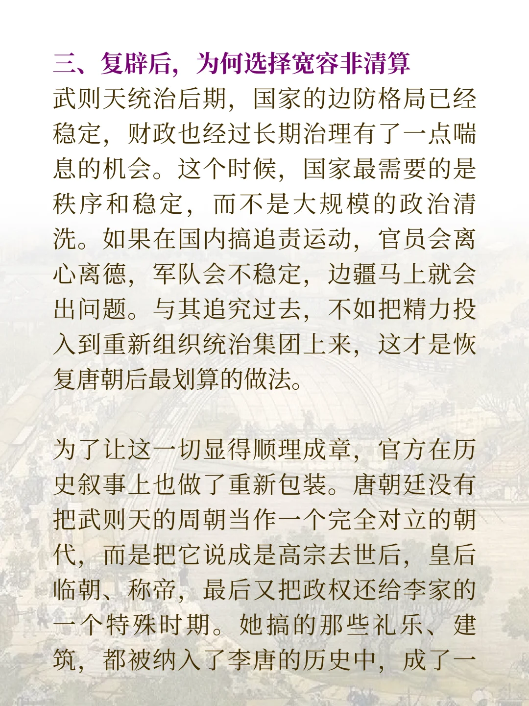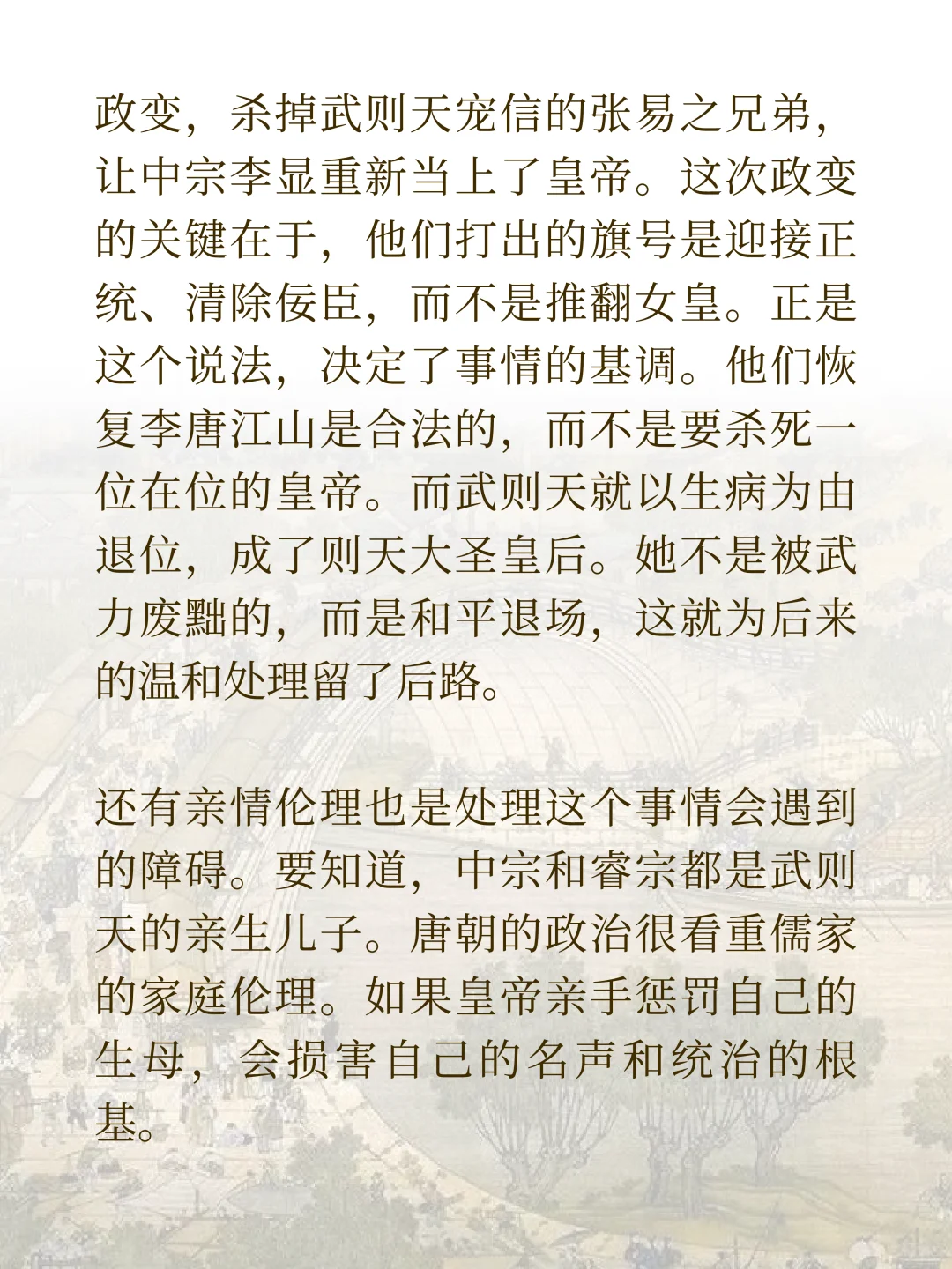 这件事听起来像是宽容,其实是当时政治上最聪明的选择。神龙政变的大臣们不敢说自己推翻女皇,只能说迎回正统。中宗、睿宗也无法对亲生母亲动手。朝廷想要稳定,边疆需要安定,官员不能乱,这时候最好的办法,就是让一切看起来像是顺理成章的交接,而不是一次流血的清算。