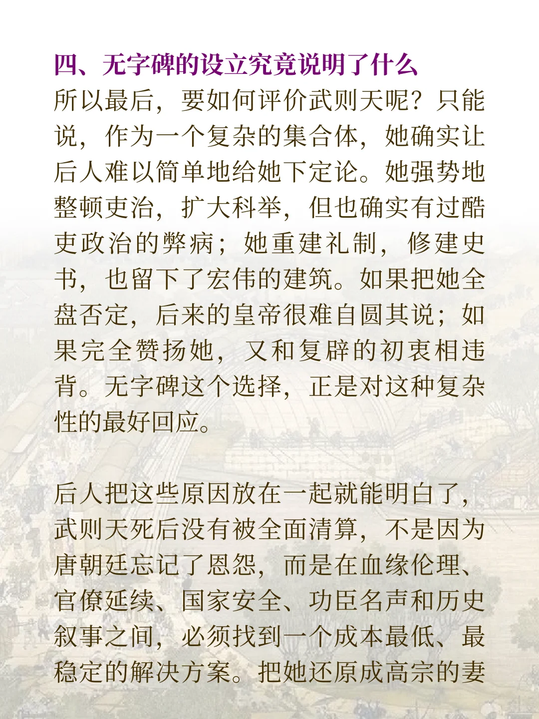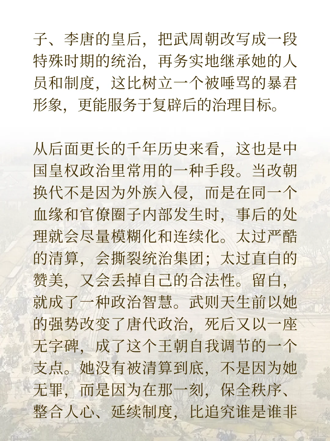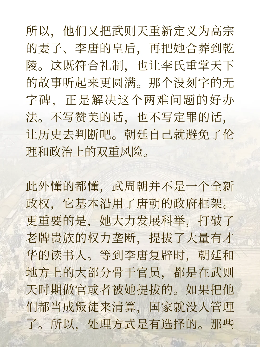 那块无字碑,其实就是历史留下的缝隙。它代表的不是沉默,而是一种智慧。唐朝选择了模糊、选择了延续,让这个王朝能平稳地回到正轨。武则天没有被彻底否定,也没有被彻底歌颂。她死后那份留白,是政治的算计,也是权力的温度。