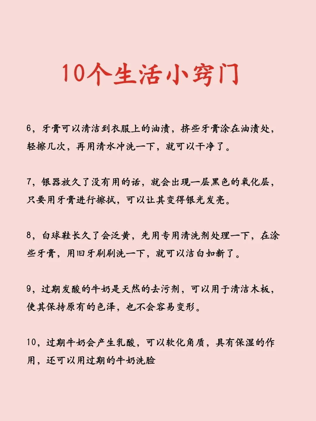 10,过期牛奶会产生乳酸,可以软化角质,具有保湿的作用,还可以用过期的牛奶洗脸。