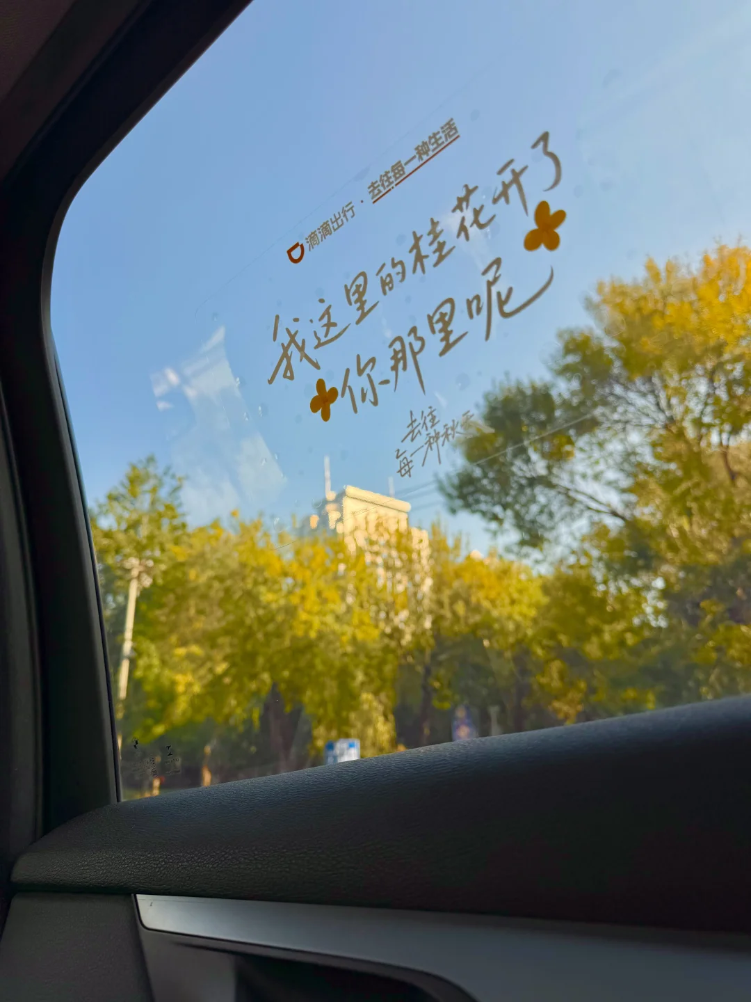 今天打滴滴去五四大街赏秋,看到了师傅车窗上的贴纸:“我这里的桂花开了,你那里呢”,仿佛听到了来自南方的小伙伴的声音[萌萌哒R]