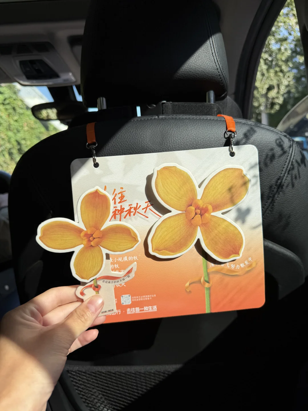 刚上车就看到椅背上挂着一朵很大又很香的桂花,轻轻一碰还能转圈哈哈,整个车里都是甜甜的桂花香的味道。