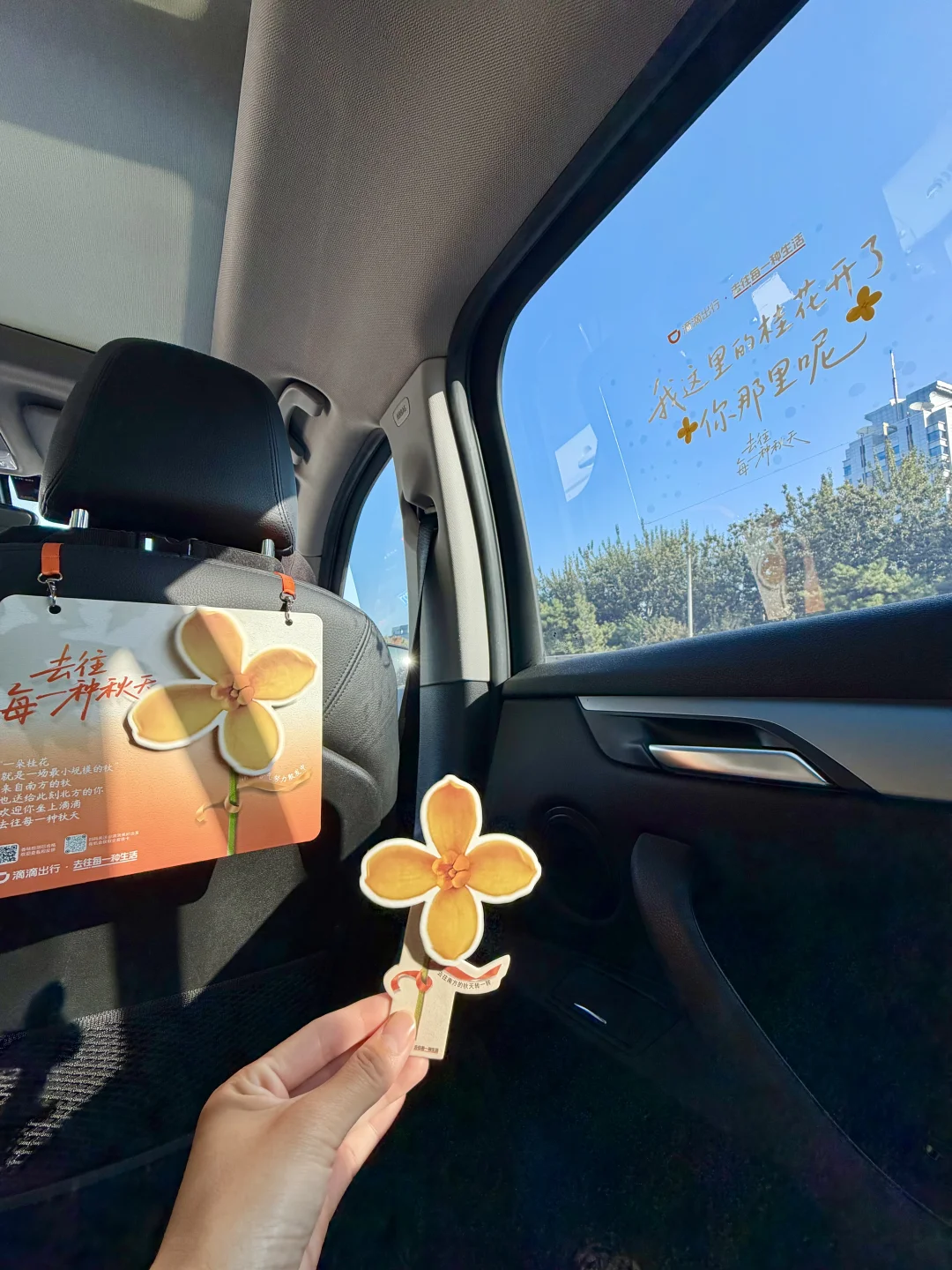 师傅还送给了我一个小的桂花香片,说这是滴滴专门为乘客准备的,打开一看好可爱真的很香[哇R]感觉把秋天的味道都搬进了车里~