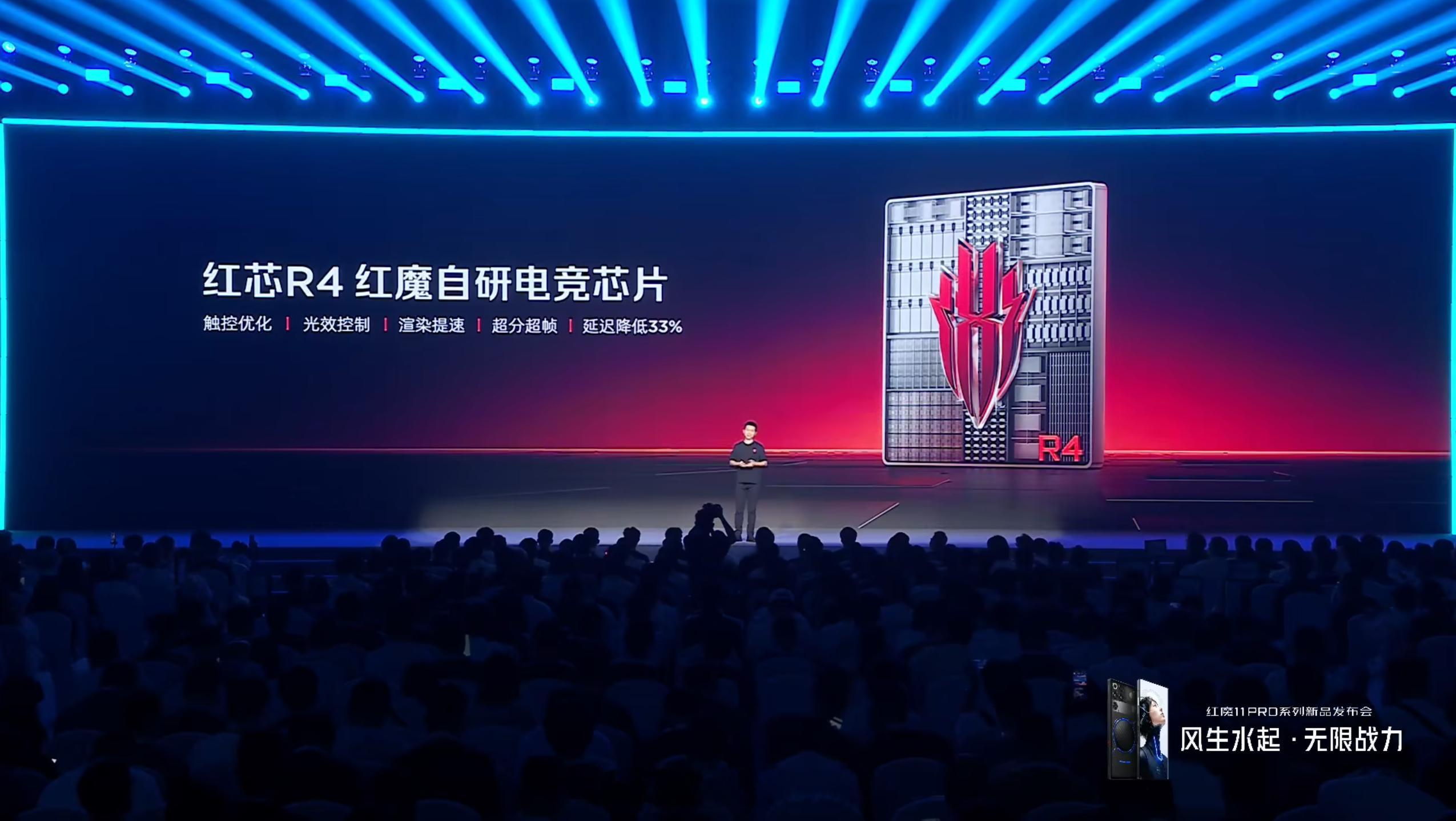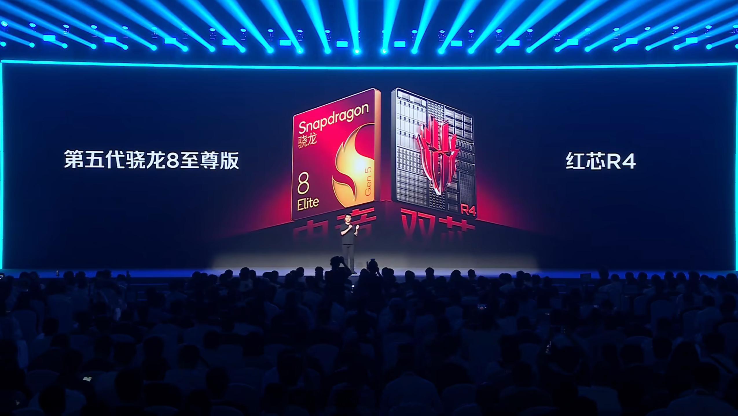 红魔 11 Pro+ 搭载骁龙 8 Elite Gen5 处理器,LPDDR5T 内存(10667Mbps),UFS 4.1 Pro 闪存,红芯 R4 自研游戏芯片(支持 2K 144Hz 超分超帧并发),安兔兔跑分 4358152 分
