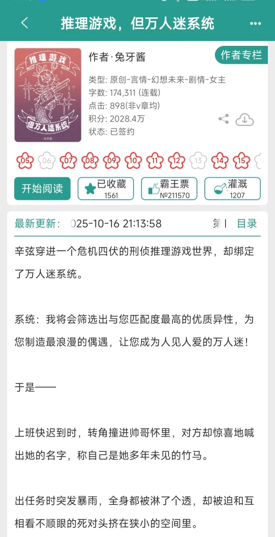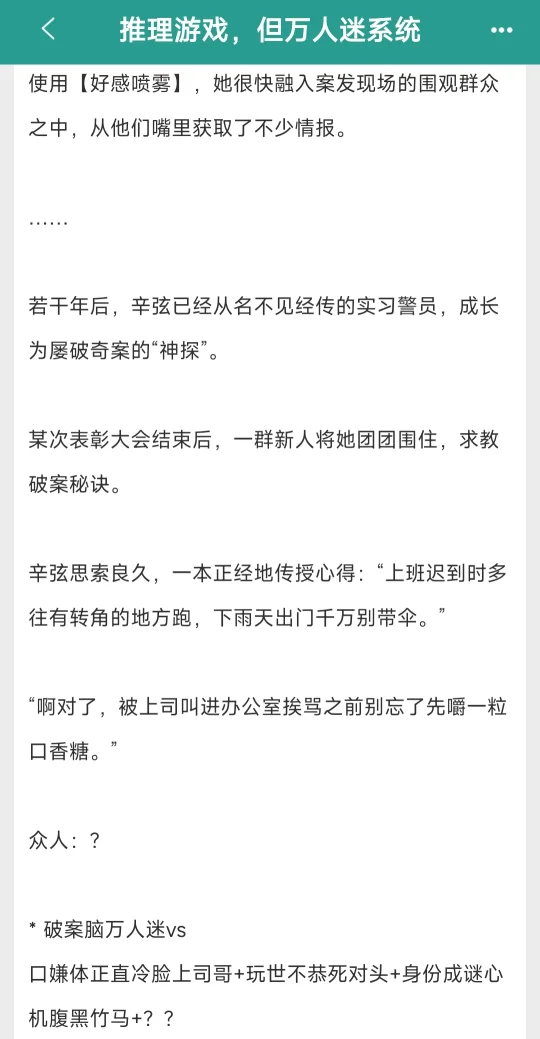 连载中可蹲完结 刑侦游戏背景下的万人迷文设定挺新奇的😍 女主穿进推理游戏,却绑定了万人迷系统,可以用男主们的爱慕值来换取各种各样的道具 女主本身就很聪明,金手指只是锦上添花,案件的反转也设计得很合理,完全不掉智商🫰🏻😋 目前出场的男主有冷脸上司哥,痞帅搭档,绿茶竹马,每一款都很香🤤修罗场摩多摩多。剧情和感情线都有!