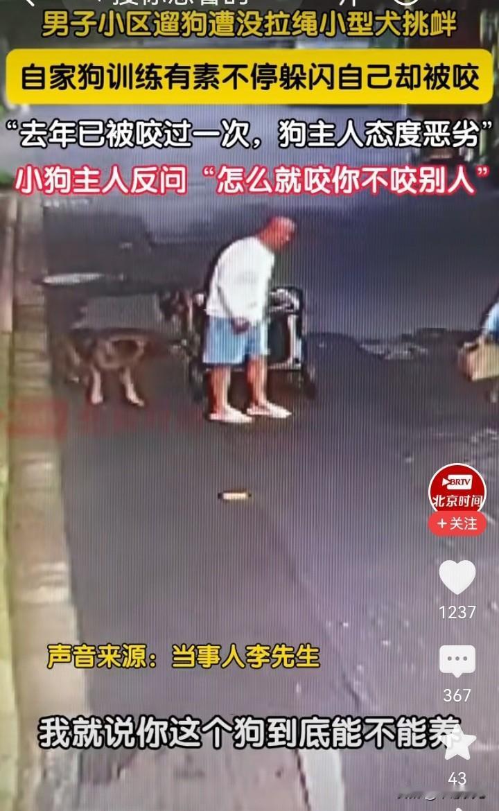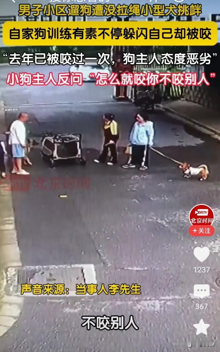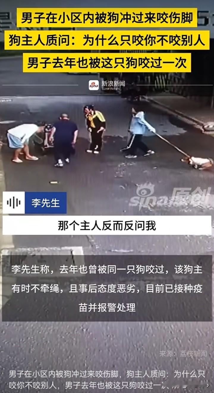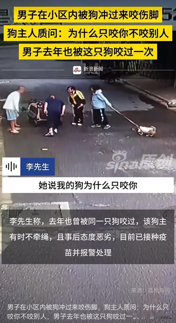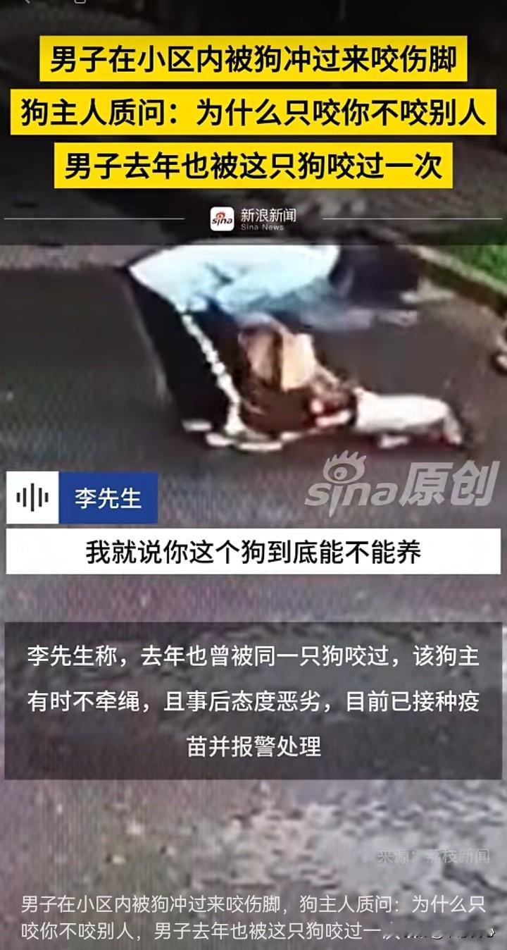 这主人是真狗🐶 我有个提议,狗咬人后,不管做了什么赔付,这个狗的主人也要被自己的狗咬一次才算扯平! 李先生被别人不牵绳的狗咬了,仔细一看,还是去年咬自己的那只狗! 虽然是小狗,没有说把李先生咬得很伤,但是,总是要再去打狂犬疫苗啊。 大家一定要记得,被狗咬到后,即使是小伤口,也要去打狂犬疫苗,不然,假如有狂犬病是没法治,要死人的。 所以,养狗遛狗不牵绳的人,往小了说,是很没有公德心的人。往大了说,这样人把别人置于生命危险之中。 假如因为种种原因,打的狂犬疫苗是失效的呢?! 离谱的是,这个遛狗不牵绳的主人,还说为何我的狗不咬别人,只咬你? 为何,确实要懂狗语的人问问才清楚啊。 每次散步,偶尔看到没有被牵绳的狗从身边跑过,都有点胆战心惊,默默问候那个狗主人! 那个咬人的狗主人,自己的狗咬过人,此后还是没有牵狗绳。这样没有公德心,把公众的生命安全置于危险之中,也不知道会受到什么惩罚。 其实,很应该让她也被咬一次,试试滋味才会学乖…… 大家认为这个提议怎样呢?