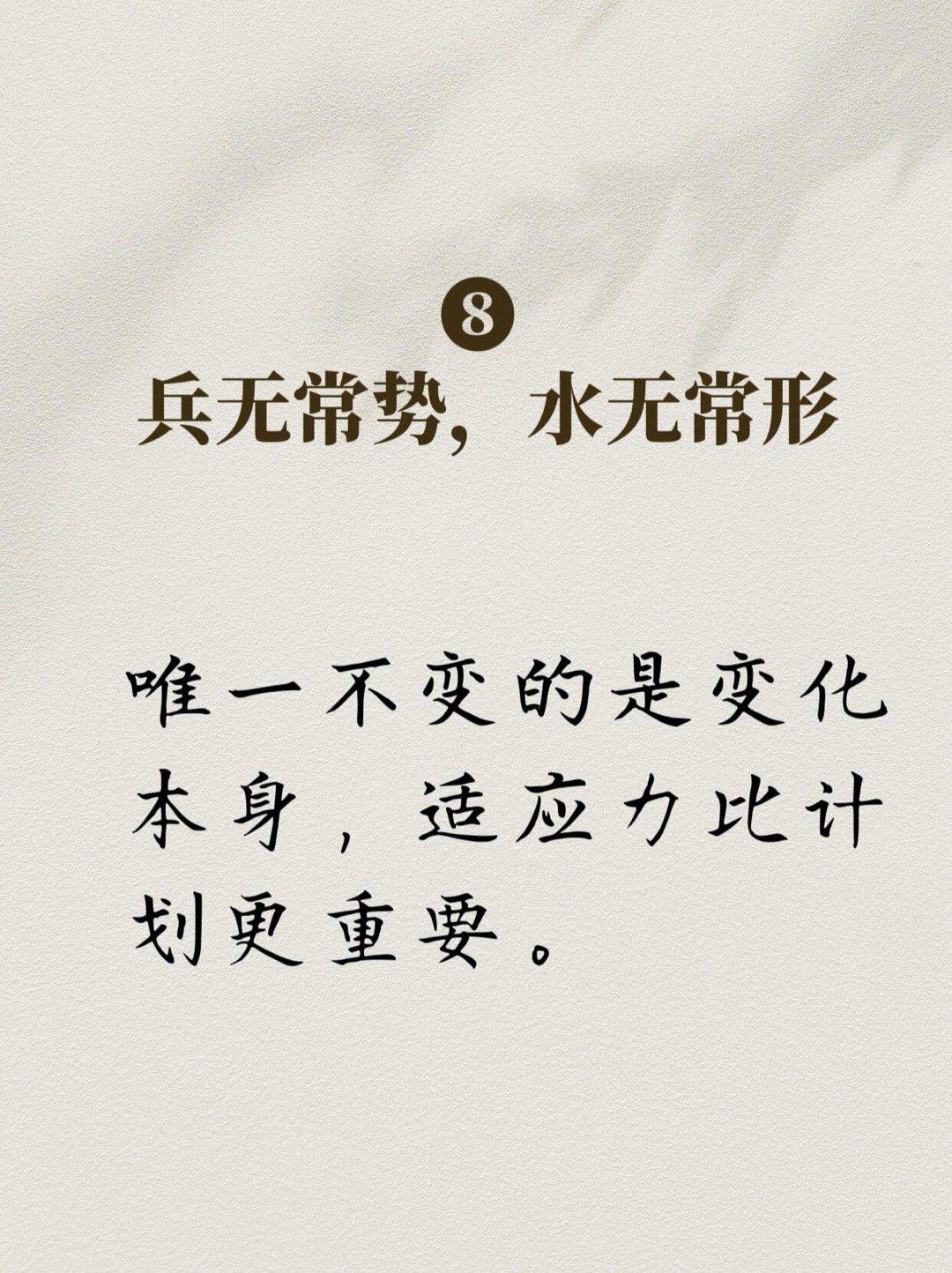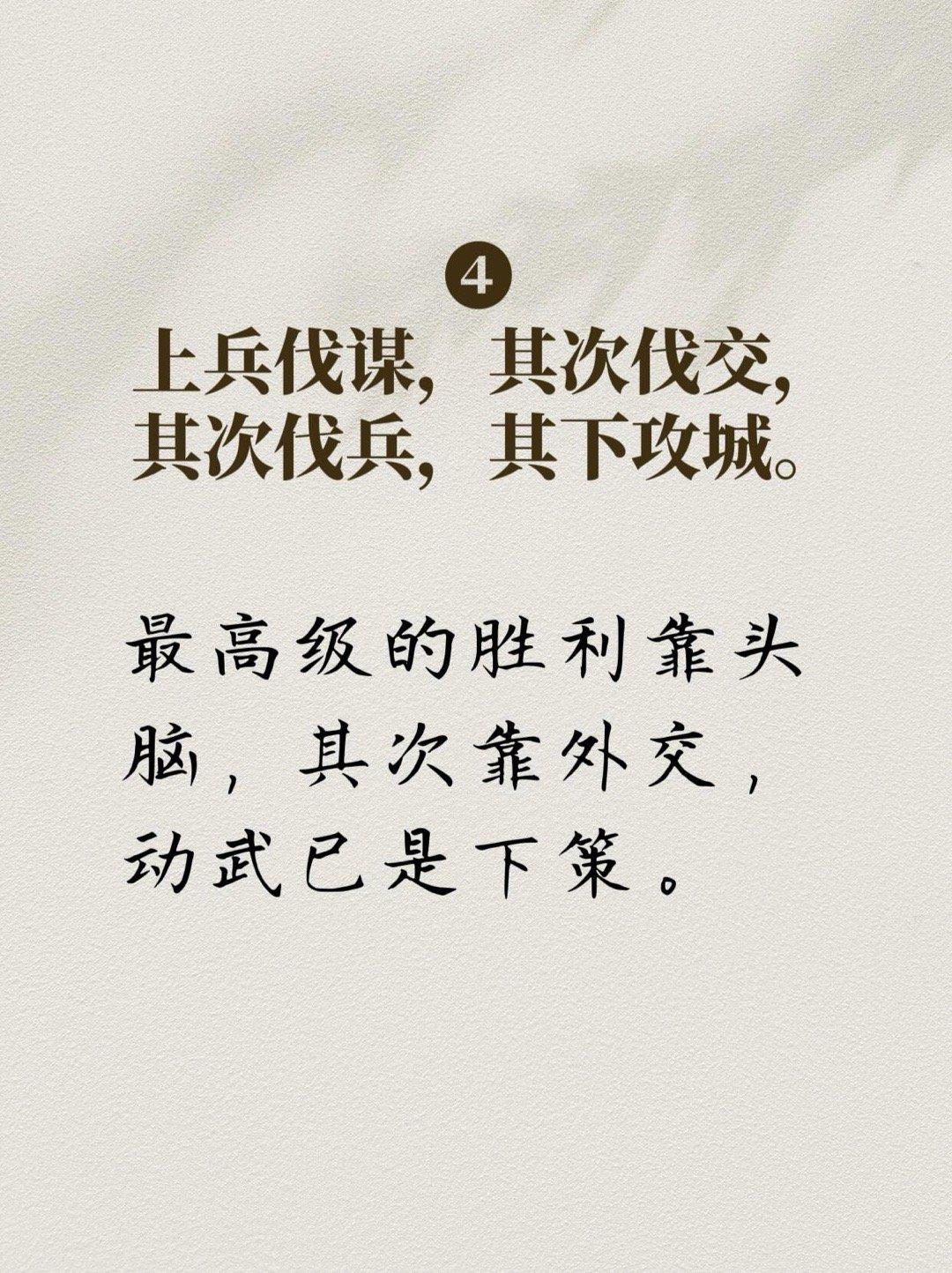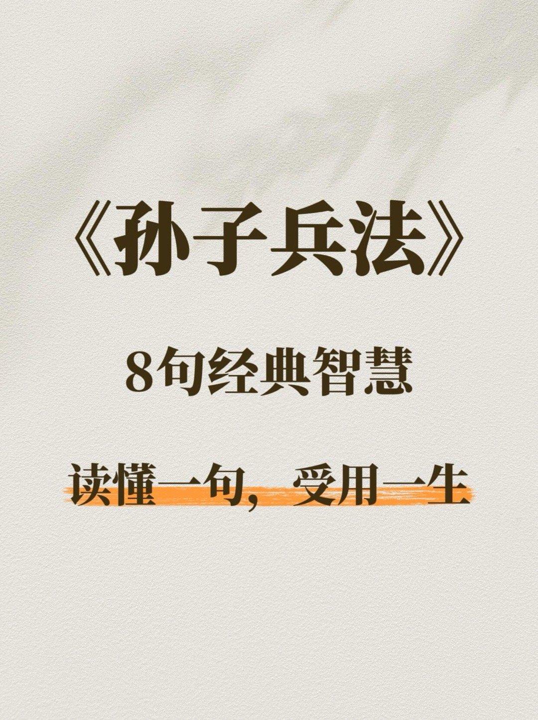 《孙子兵法》8句经典智慧,每一句都非常的经典,读懂受用一生。 比如,知己知彼,百战不殆;意思是了解自己与看清对手同样重要,先向内观,再向外看。 再比如,不战而屈人之兵,善之善者也。意思是真正的智慧不是硬碰硬,而是用策略化解冲突。 这八句话,周少建议大家保存下来,没事多看看《孙子兵法》,多学一学其中的谋略智慧,哪怕读懂其中一句,都能少走10年弯路。#寻美三湘##长沙新朋友# 孙子兵法 三十六计 鬼谷子原版原著为人处世军事谋略奇书