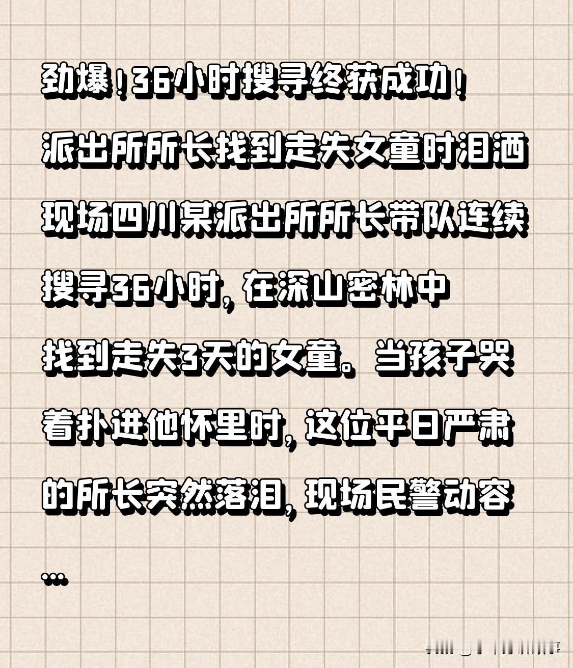 劲爆!36小时搜寻终获成功!派出所所长找到走失女童时泪洒现场 四川某派出所所长带队连续搜寻36小时,在深山密林中找到走失3天的女童。当孩子哭着扑进他怀里时,这位平日严肃的所长突然落泪,现场民警动容。据悉,搜寻期间他摔伤膝盖仍坚持,称“孩子安全比什么都重要”。网友点赞:“这滴泪比任何勋章都珍贵!”“人民警察为人民,致敬!”