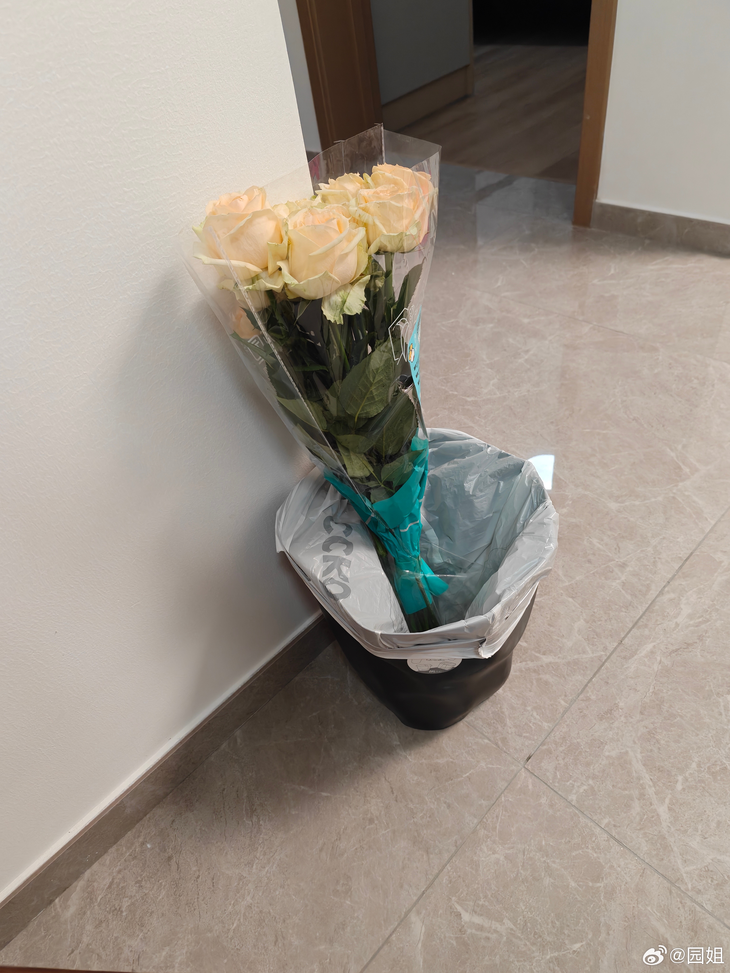上我姐家做客本来想买花放客厅餐桌。谁知道他家没买花瓶。现在只能养在垃圾桶里[挖鼻]