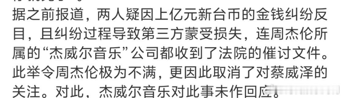 周杰伦曾多次提携蔡威泽周杰伦或被欠上亿新台币周杰伦警告蔡威泽再不出现就完了曾称“