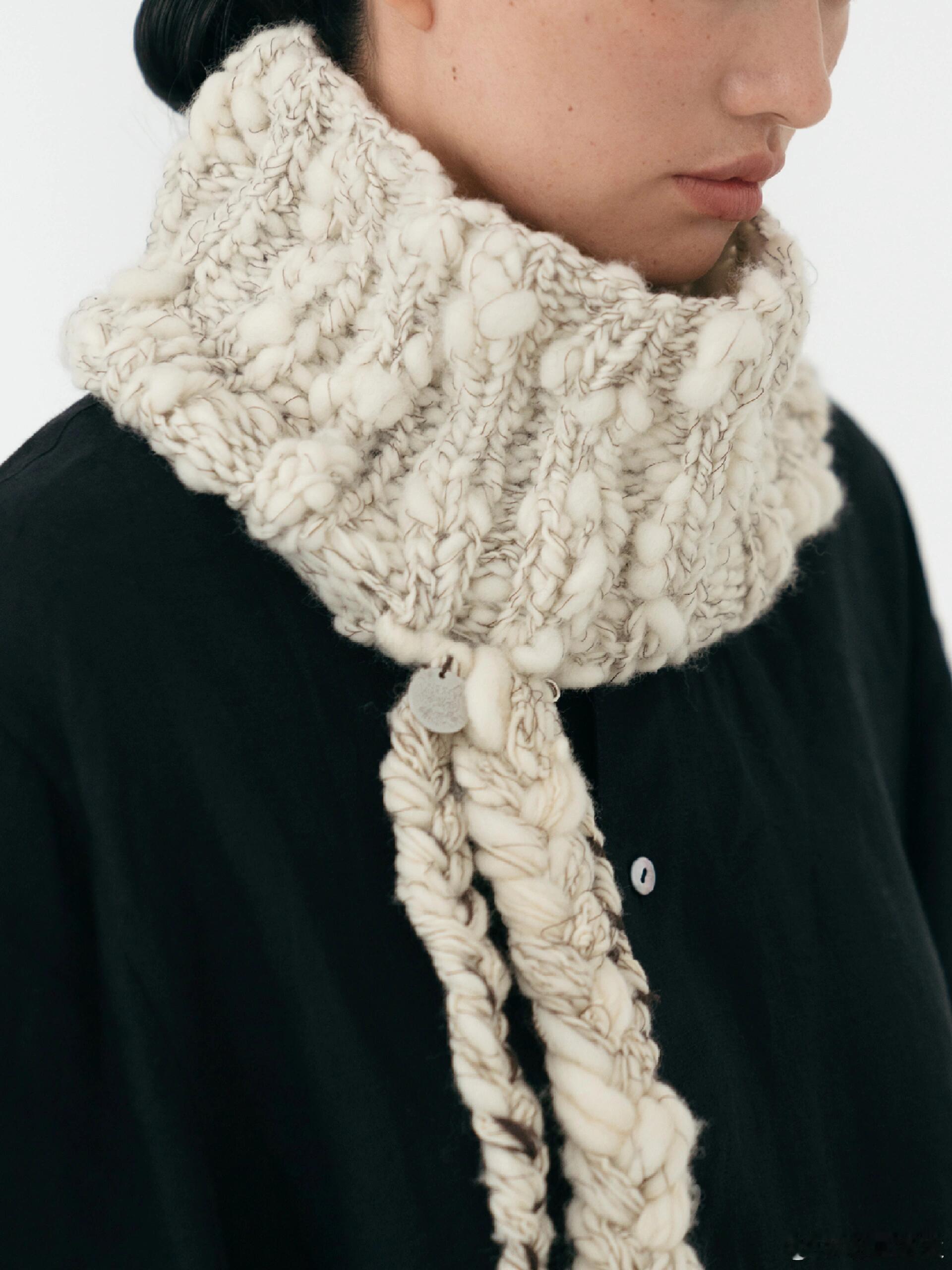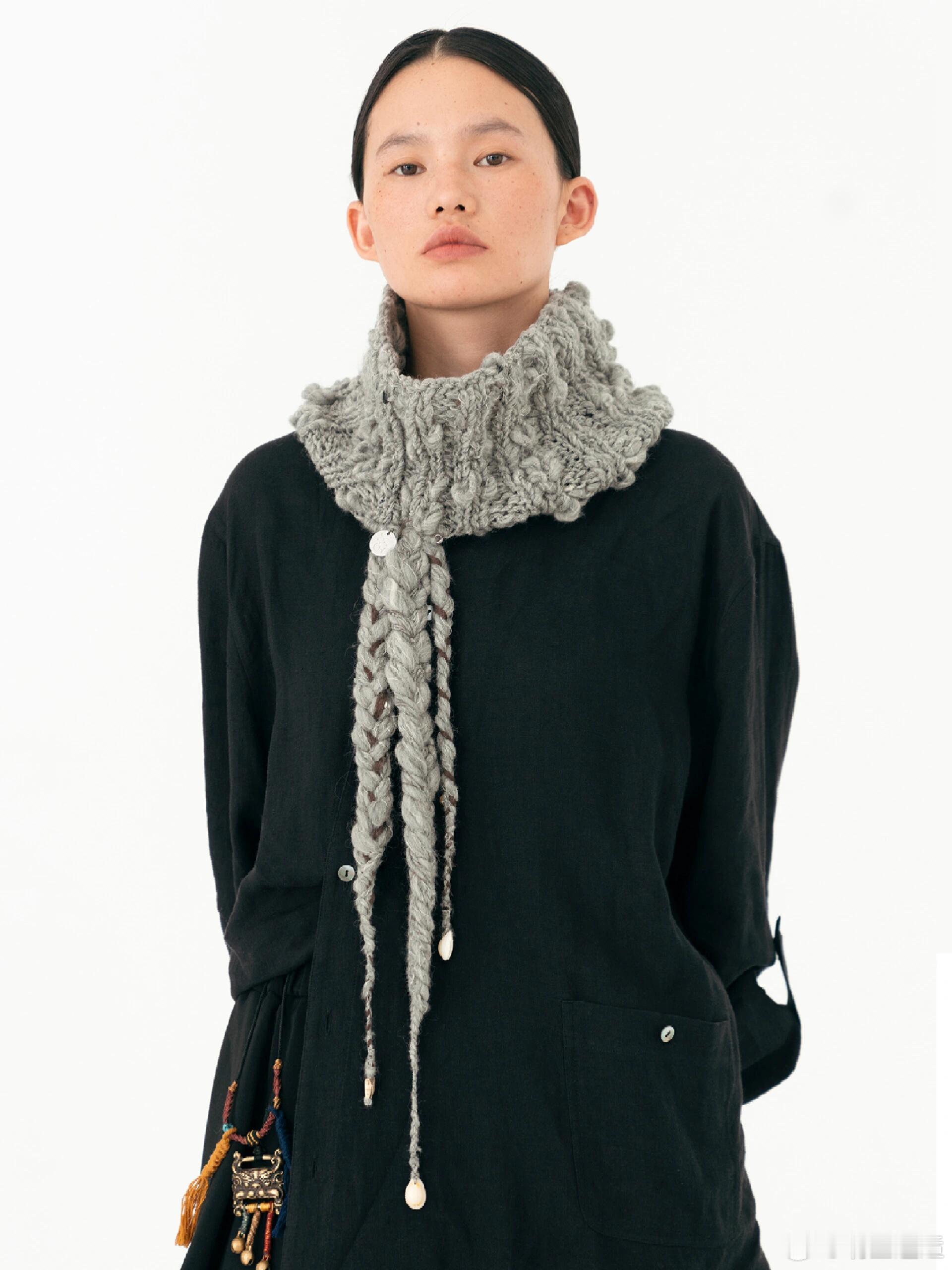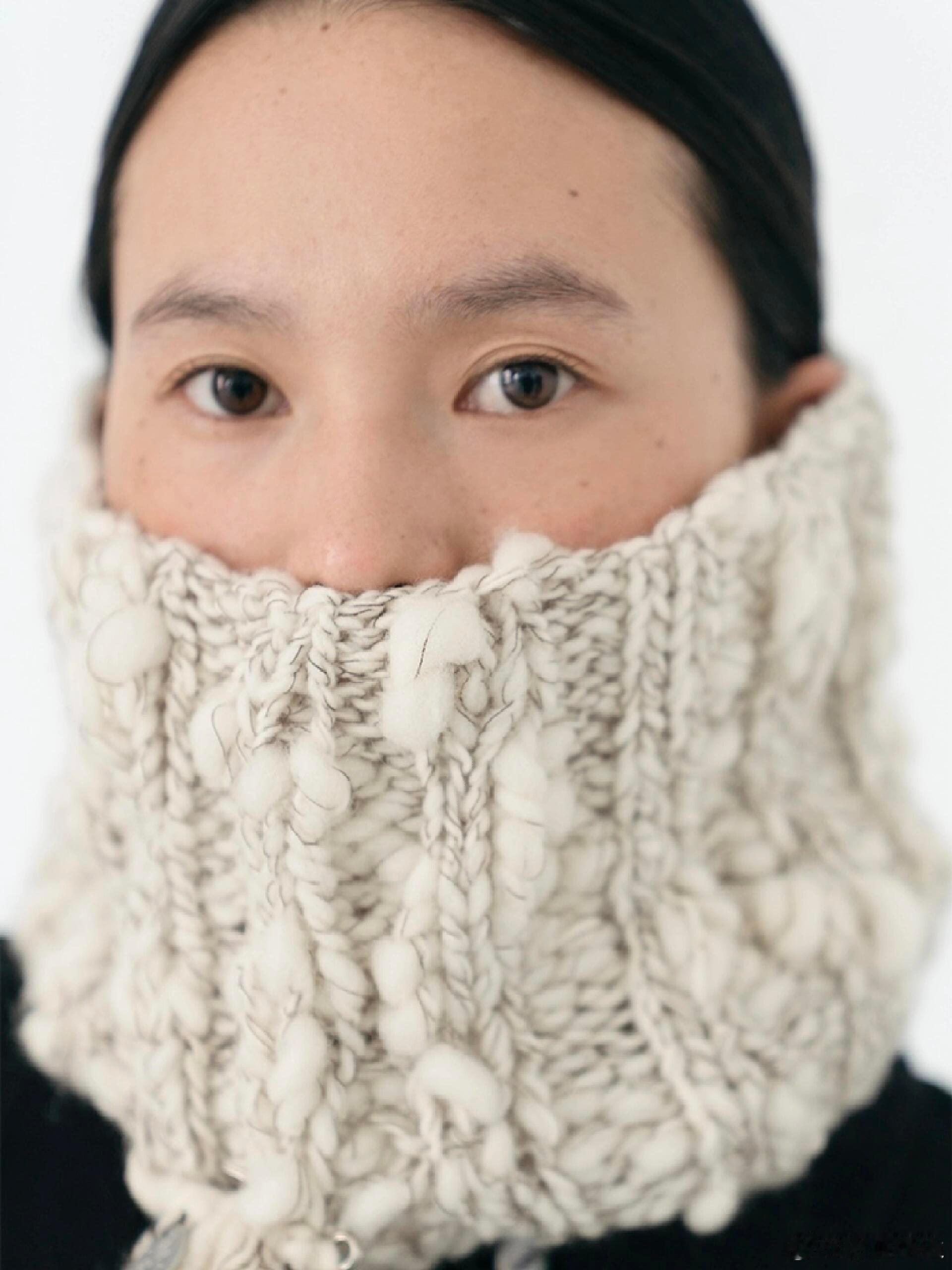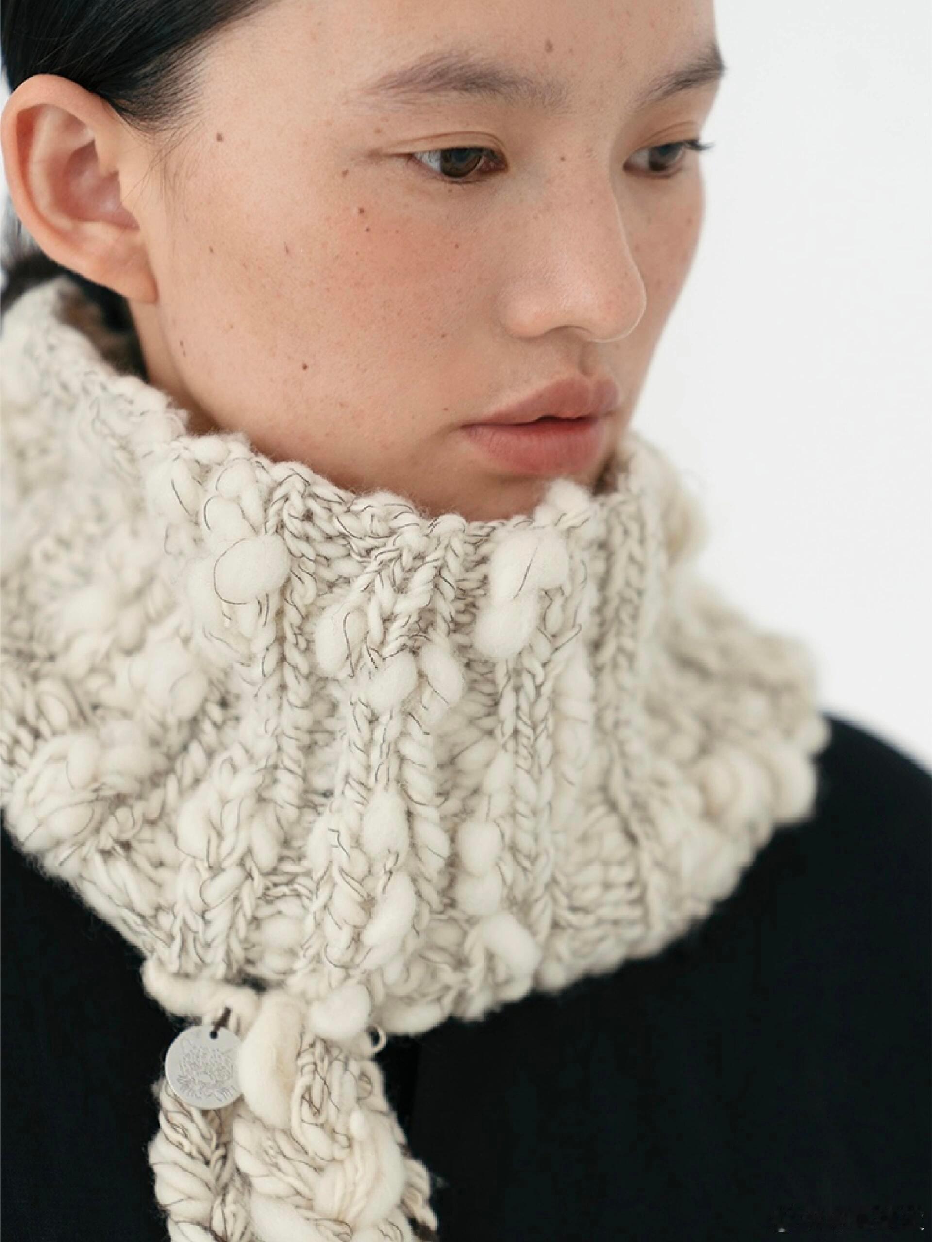 这条围巾是整体造型的温暖核心。它以纯净的白色为主调,采用粗棒针织工艺,形成饱满立