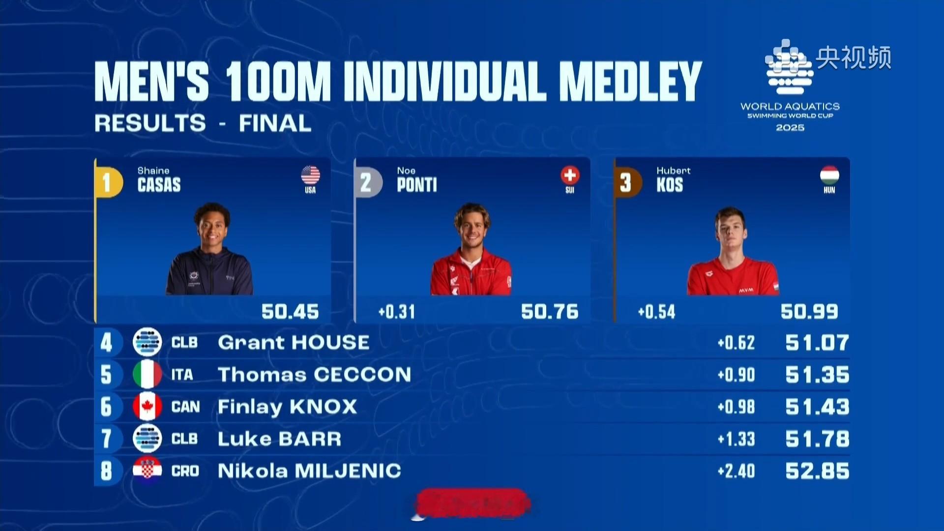 短池游泳世界杯维斯蒙特站男100混决赛泡面50.45Ponti50.76K