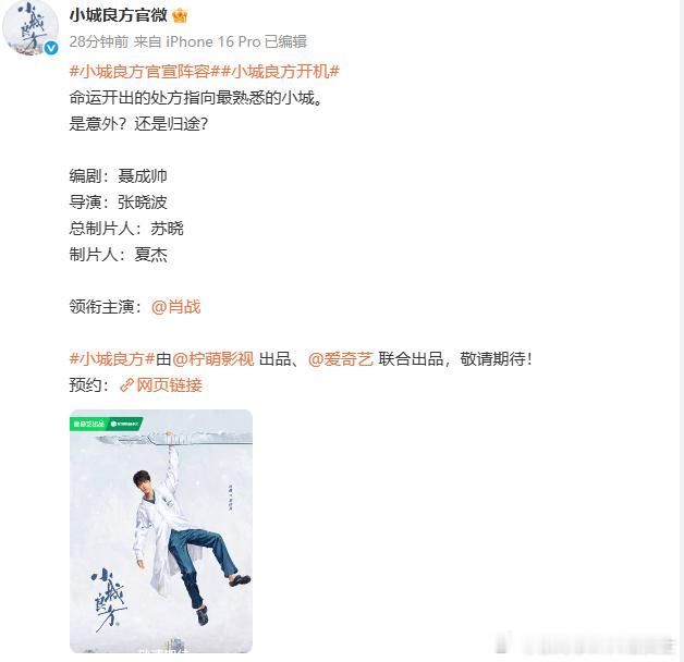 肖战新剧单独官宣小城良方单独官宣肖战肖战新剧定了!《小城良方》中饰演落难天才医生,在东北烟火气里重拾初心。