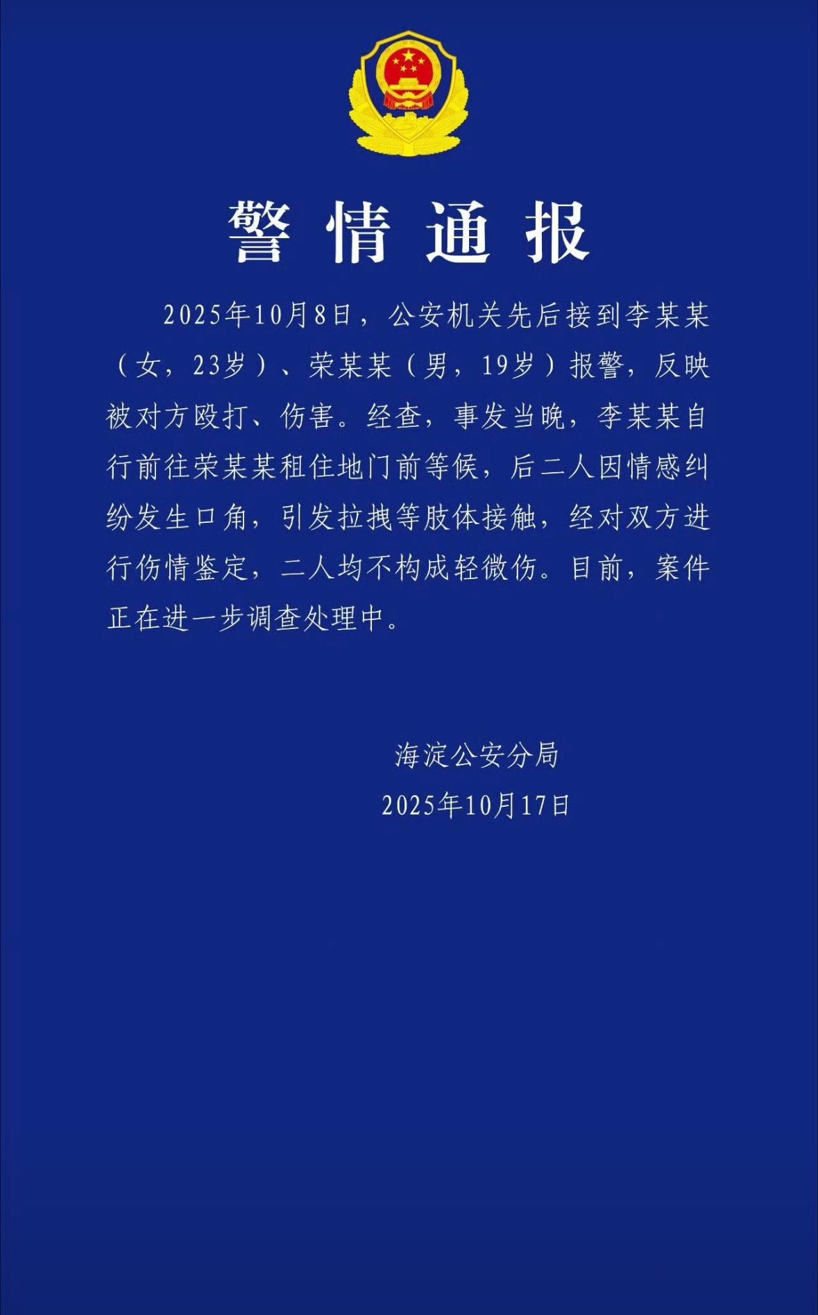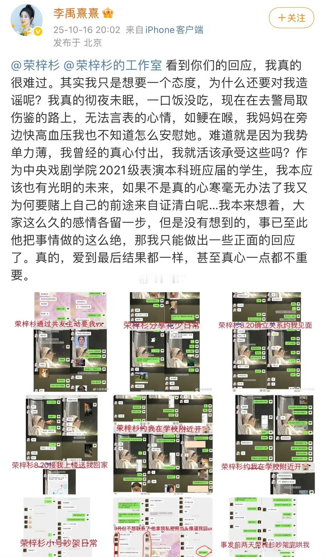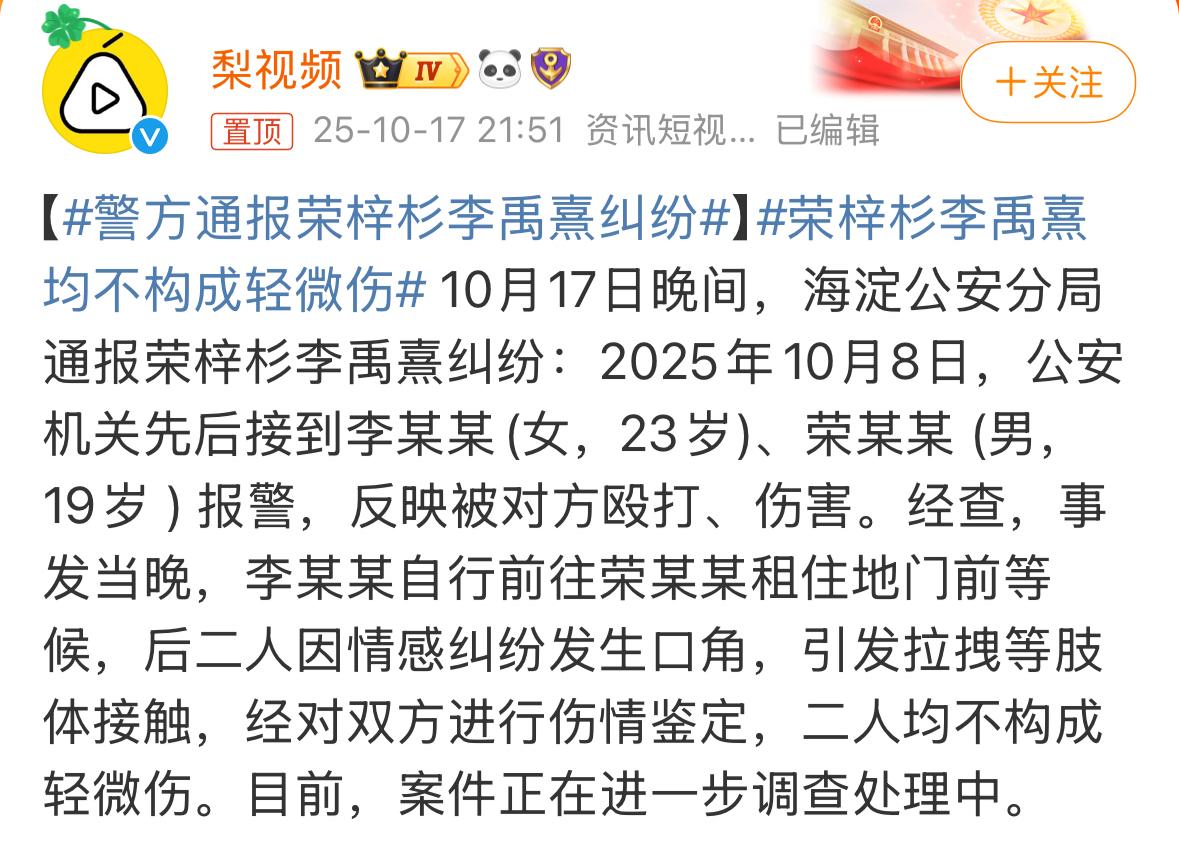 荣梓杉是谁⁉️ 06年生的他拿下中戏北电双料第一‼️ 今年19岁‼️ 最火的角色是《隐秘的角落》里让人毛骨悚然的朱朝阳✅ 情感纠纷感觉是被人做局了,在娱乐圈这么久,不会连这点常识都没有,海淀警方的通报也明显看出根本就不是恶意伤害,也许对方想通过这个事件拿捏他😪🫣 海淀警方通报:“二人因情感纠纷发生口角、引发拉拽,均不构成轻微伤”。 荣梓杉工作室此前已发声明,称与李某某从未建立恋爱关系,并指控对方长期骚扰。 声明中还称,自2025年初以来,李禹熹多次对荣梓杉实施严重骚扰,包括非法尾随、偷拍、传播艺人行踪信息及隐私照片等行为。 工作室表示已通过法律途径维权。 同时,中央戏剧学院本科招生办公室工作人员也回应了关于荣梓杉文化课的传闻,明确表示:“如果(文化课)没过线的话,是没法录取的。” 当被问及荣梓杉是否走了“补录”渠道时,工作人员表示不清楚“补录”是什么意思,并强调荣梓杉是通过正常渠道录取的。 真是命途多舛,一波三折‼️ 尽管经历了风波,荣梓杉的演艺之路仍在继续。 从《山河故人》中的张到乐,到《隐秘的角落》中的朱朝阳,再到《秘密访客》中的汪楚祺,荣梓杉一直在挑战不同类型的角色。 他主演的古装历史题材影片《沙海之门》还未定档,片中他将与邓超上演生死搏杀,值得期待👍 荣梓杉曾在采访中说到自己的理想:“希望能够达到像段奕宏老师或者是黄渤老师那样的成就,就是纯靠演技吃饭。” 希望他能坚定信念,不忘初心👊 演员荣梓杉,未来可期👊 荣梓杉恋情 荣梓杉