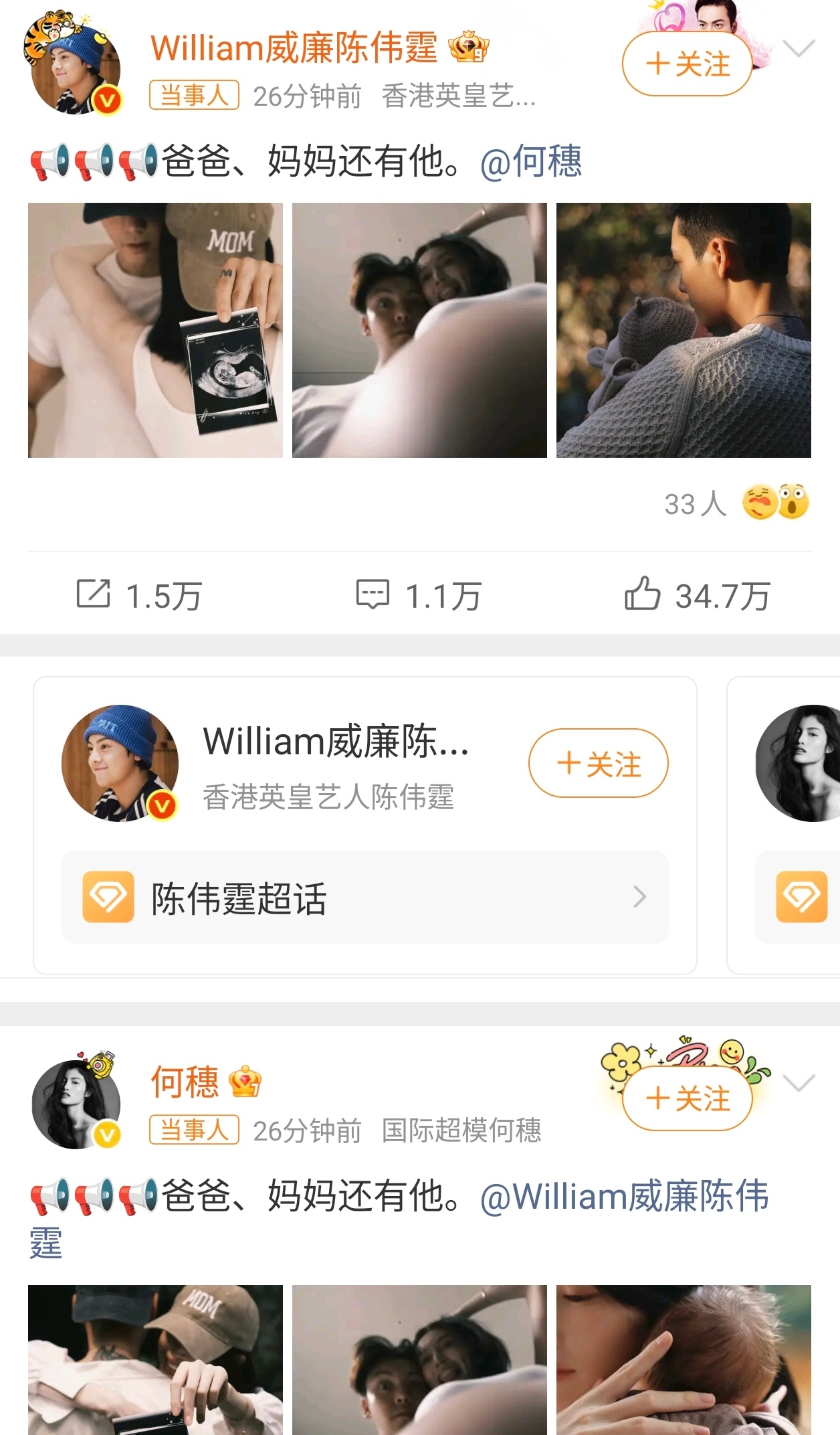 陈伟霆何穗官宣生子我滴妈呀,有点突然,估计马上就要空降热搜第一了,恭喜恭喜!(怎