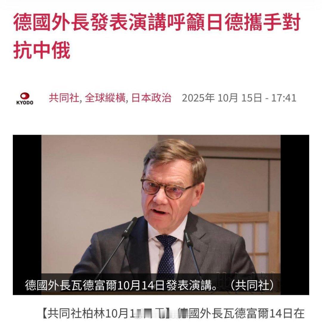 “德国外长Wadephul于14日在柏林演讲时呼吁,日本和德国应该加强合作,共同应对俄罗斯和中国。”