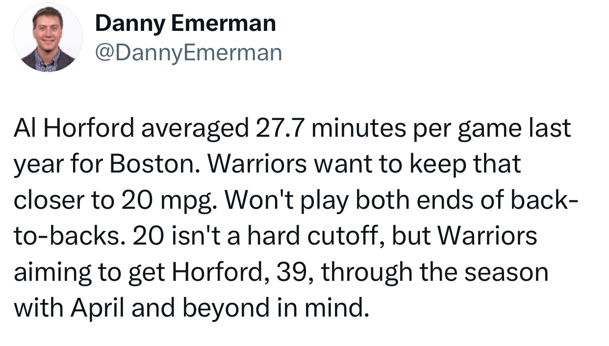 勇士记者danny emerman谈霍福德:“艾尔霍福德去年在波士顿凯尔特人队场均上场27.7分钟。勇士队希望将这个数字控制在20分钟左右。他不会在背靠背比赛中同时出场。20分钟并非硬性规定,但勇士队的目标是让39岁的霍福德打完本赛季,并考虑到明年四月及之后的情况。”
