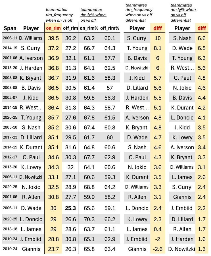 队友在场与不在场时的进攻产出表现:纳什和韦德似乎最擅长为队友创造篮下出手机会;即便没有奥尼尔或勒布朗,韦德的这一能力依然突出,而纳什在没有斯塔德迈尔的情况下,该能力则有所下滑。库里的表现自成一档;而且他能将金州勇士队打造成一支像具备奥尼尔时代风格的篮下冲击力球队。