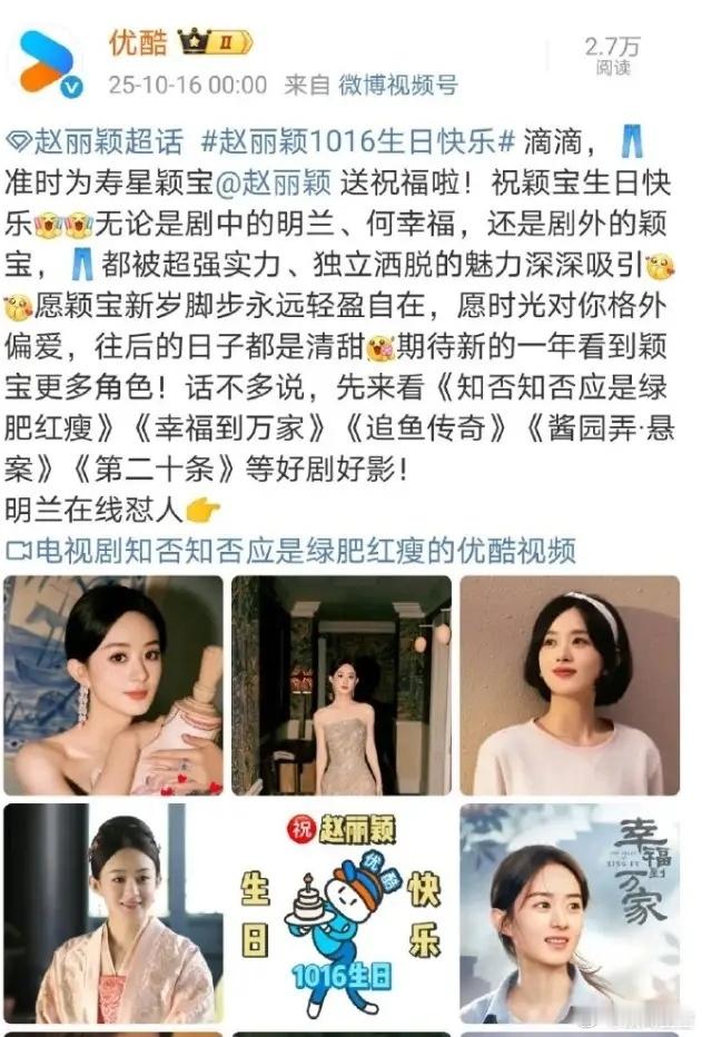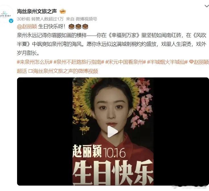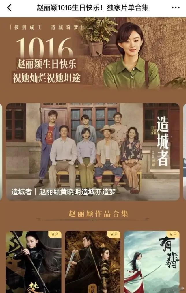 她自己挺低调的,但是爱优腾三大视频平台掐点给她庆祝生日,湖南卫视连发11条动态为她庆生,腾讯视频给她设置了生日专栏,泉州文旅发视频给她庆生,科兰黎包下上海外滩户外大屏为她庆生,而且线下店铺所有LED都换成了赵丽颖生日快乐,平台是因为作品,文旅是因为她靠个人影响力带火了簪花围,靠实力赢的的祝福。