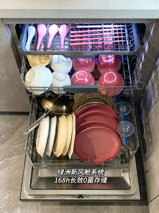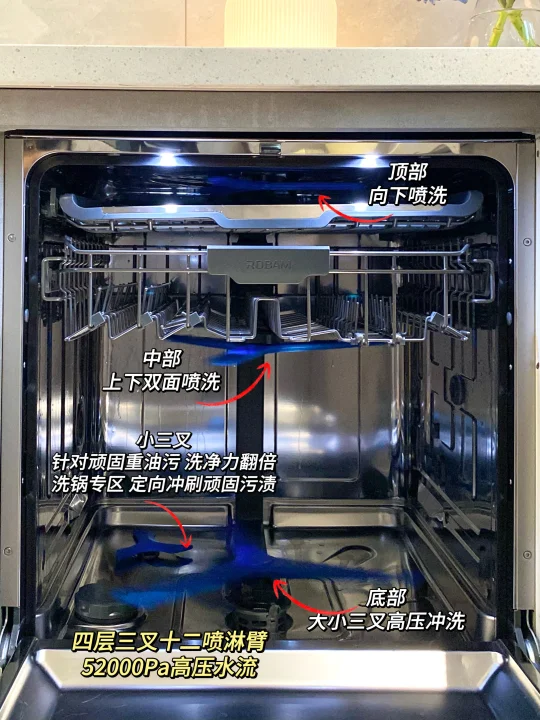 四层三叉十二喷淋臂+52000Pa高压水洗也超给力,大叉转一圈能立体洗4次,小叉专治顽固污渍——喝剩的牛奶杯、油乎乎的牛油碗、就连我家毛孩子吃过的碗碟,洗完都跟新的一样!