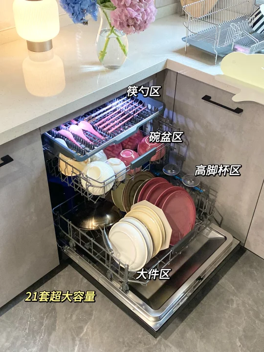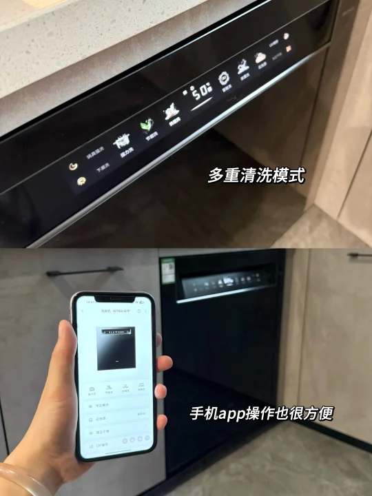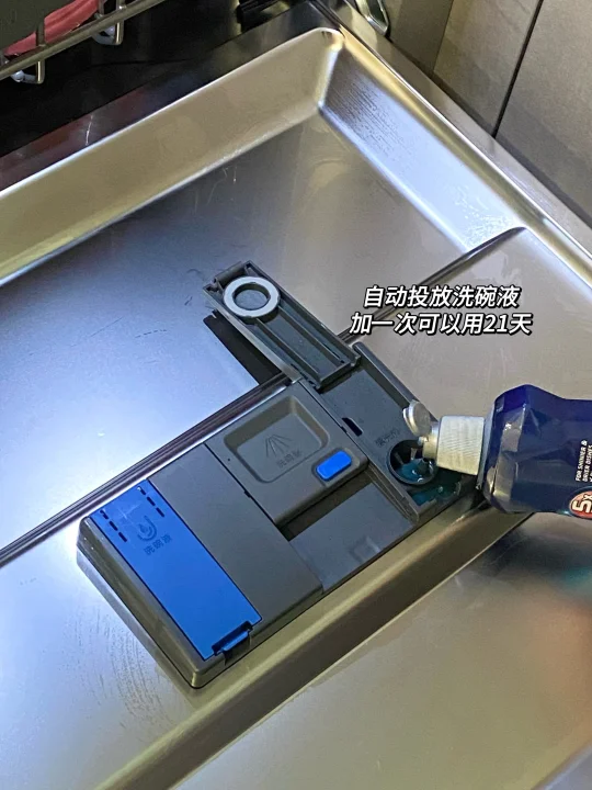 而且它还超省事儿!洗碗液一次加满能用三周,还能根据餐盘量智能控量控水,懒人直接狂喜🥳~平时不在家,长辈不会用也没关系,远程APP一键就能启动清洗🧽,超省心!