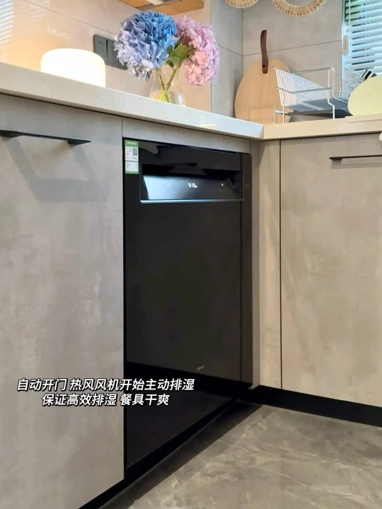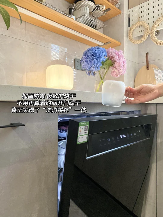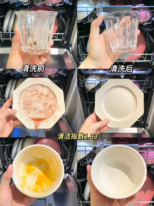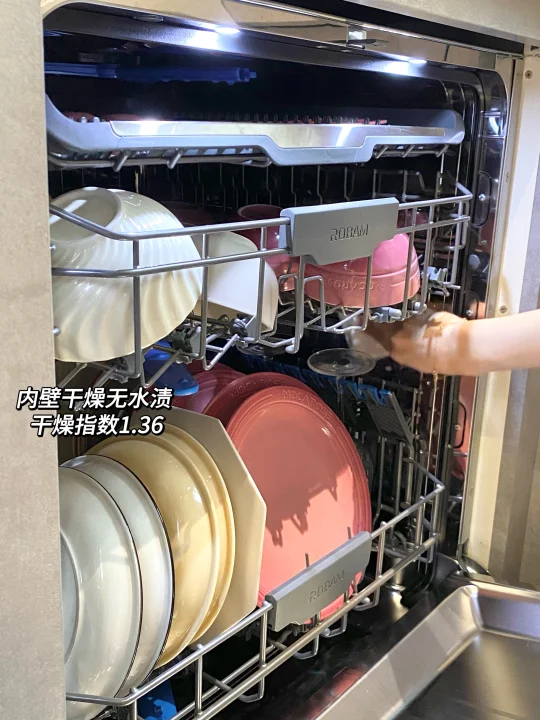 最让我惊艳的是它的烘干能力!洗完会自己开门排水汽+自动关门热风烘干,干燥指数高达1.36,拿出来的餐具干爽锃亮,内壁连个水珠都没有💧,根本不用再放进烘干机,第二天直接用超方便!