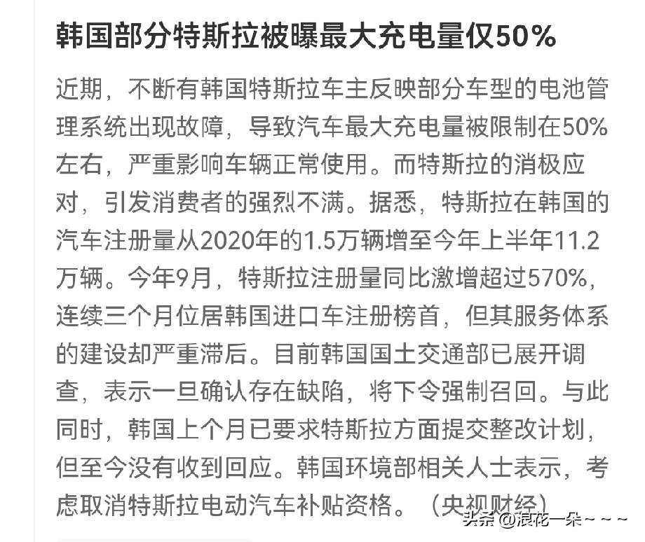 曝! 韩国部分特斯拉最大充电量仅达50%! 你们说是韩国人容易吗?好不容易买一辆特斯拉,还出现这样的系统问题。 其实,特斯拉本身允许车主通过APP或车载屏幕将充电上限设为50%,以延长电池寿命,是属于正常功能选项。 但,这次报道中的50%充电限制是非预期的故障表现,车主无法自主解除,且特斯拉官方仅建议更换电池组作为解决方案,尤其对过保车辆收取高额维修费用,所以,引发了韩国车主的不满。 看这特斯拉,如果再不抓紧一点把服务提上去,股价又要承受巨大的压力啊! 还是建议韩国人买比亚迪吧!可靠又放心更实惠!
