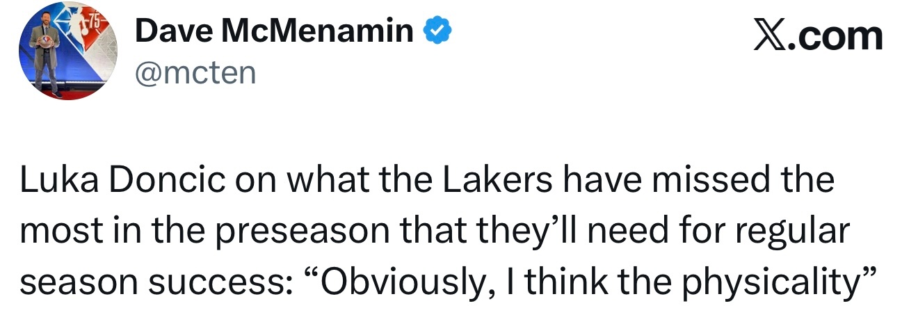 东契奇谈到湖人队在季前赛中缺少了什么,而这些正是他们在常规赛中取得成功的关键:“显然,我认为是身体素质。”