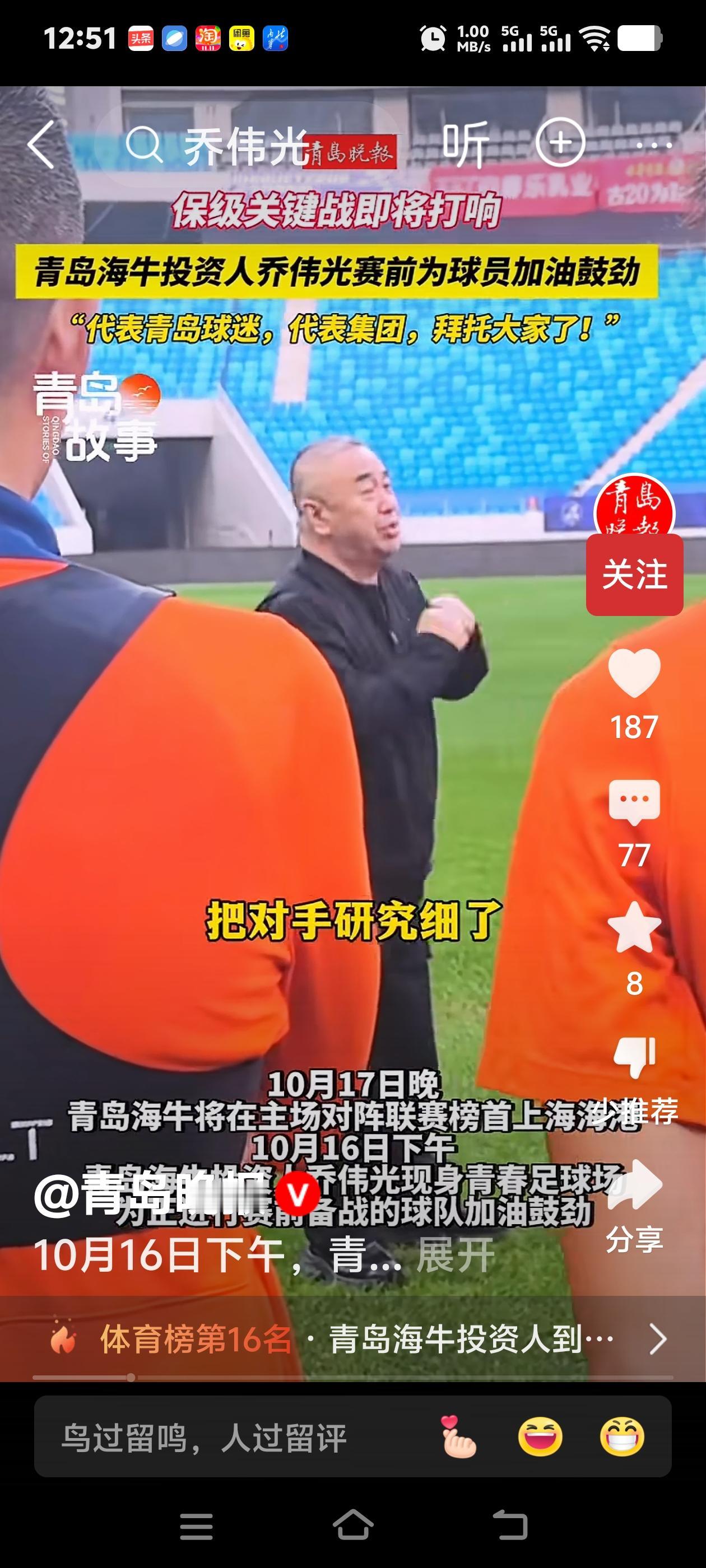 海牛主场3:4惜败中超领头羊上海海港,令人扼腕。 从领先到追平,再到补时5分钟打进一球,青岛海牛“不松懈、不动摇、不放弃”的气势,令人肃然起敬。看来,赛前乔总的加油鼓劲起到了巨大的作用:我们是保命的,别让海港趟着我们夺冠。 当年海牛九家球迷协会联合征战泰山队的傲娇身姿,时隐时现。 只是输了,就是输了。即便是高傲的虽败犹荣,宝贵的三分还是没了。 虽然久经风雨的乔总很坦诚,今年可能到现在比较难,但命运掌握在我们自己手里。但是,本场比赛失利之后,青岛海牛保级仅剩理论上的可能了。无论是感谢队员的拼搏,还是感谢到场球迷的支持,还有“希望未来的比赛能像今天一样发挥出来全部水平”,主帅李霄鹏的鼓励,更多的像是例行公事了。 上个赛季最后一轮,还是沧州雄狮主帅的李霄鹏,送上了保命的一分,青岛海牛极其惊险的留在了中超。本赛季的海牛,很难有此幸运了。 环顾中超19支球队,或许没有第二个“雪中送炭”的李霄鹏了。其二就是,乔总也很难再拿出400万巨额保级奖金了吧。有这钱,早买上两个高水平外援,何至于如此遭罪。 不知道曾经的400万保级奖金兑现了吗? 看看双方首发球员的身价,海牛输球似乎也合乎情理。海牛队首发总身价217.5万欧元,而上海海港则是1005万欧元,几乎是海牛的5倍。 可是,比赛除了实力之外,还有战术运用的智慧、主场观众的山呼海啸。青岛海牛现场观众的鼎力支持,从来都是让客队看的“羡慕嫉妒恨”的。 但青岛海牛的比赛策略,确是让人一头雾水。 海牛的“宁要屋碎、不要瓦全”,固然令人敬佩,但是如此的“一根筋”,对于拿到价值连城的积分,似乎没有什么实际帮助。而遇到保级对手,却是非输即平,温柔体贴。 以中超21轮到26轮这6轮比赛为例。长春亚泰分别在21、22轮战胜梅州客家、深圳新鹏城,拿到6分。23、25、26轮分别拿到平局的1分。六轮拿到了9分。而青岛海牛六战中,先后输给申花、梅州客家,平了成都蓉城、河南队、泰山队、长春亚泰,只拿到了可怜的四分。只有长春亚泰的一半分数。 如果说,与成都蓉城、泰山队扳手腕,打成平局很自豪的话,1:0输给梅州客家,2:2放生长春亚泰,青岛海牛又是为了啥呢? “我的草原我的马,我想咋耍就咋耍”? 获得过中超最佳教练的李霄鹏,在豪门泰山队执教的时候,也不是这样的吧。 遇强更强,遇弱更弱,这是哪路兵法? 厨师教的吧。 你都流鼻涕了,还管别人是否感冒? 或许力挺李霄鹏的乔总,还是能够理解的。 中超第28轮,青岛海牛客场对阵北京国安,对于急需证明自己的新帅拉米罗来说,这三分恐怕已经入账了。 明年的海牛,大概率中超是很难见到了。不知道青岛人李霄鹏是否会随队,一起去领略中甲的另类风景。 去中甲歇歇吧,年年保级太累了,闹心吧啦滴。