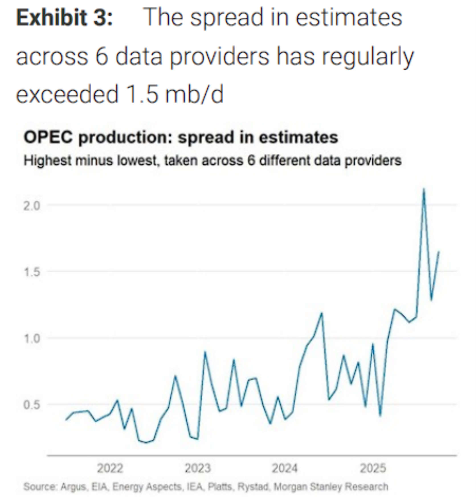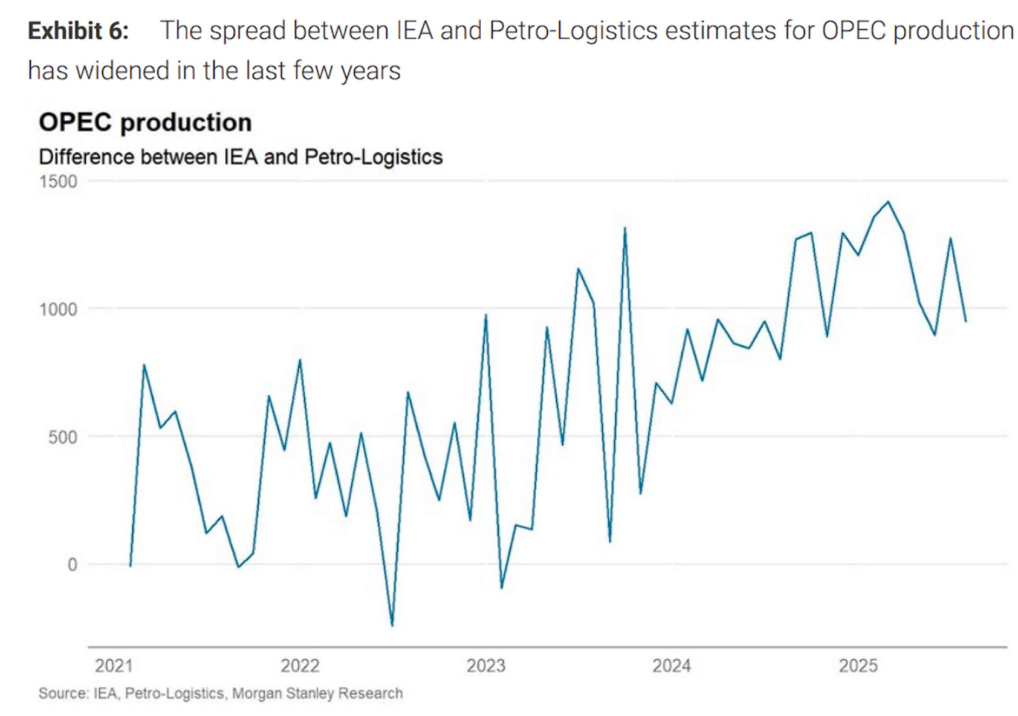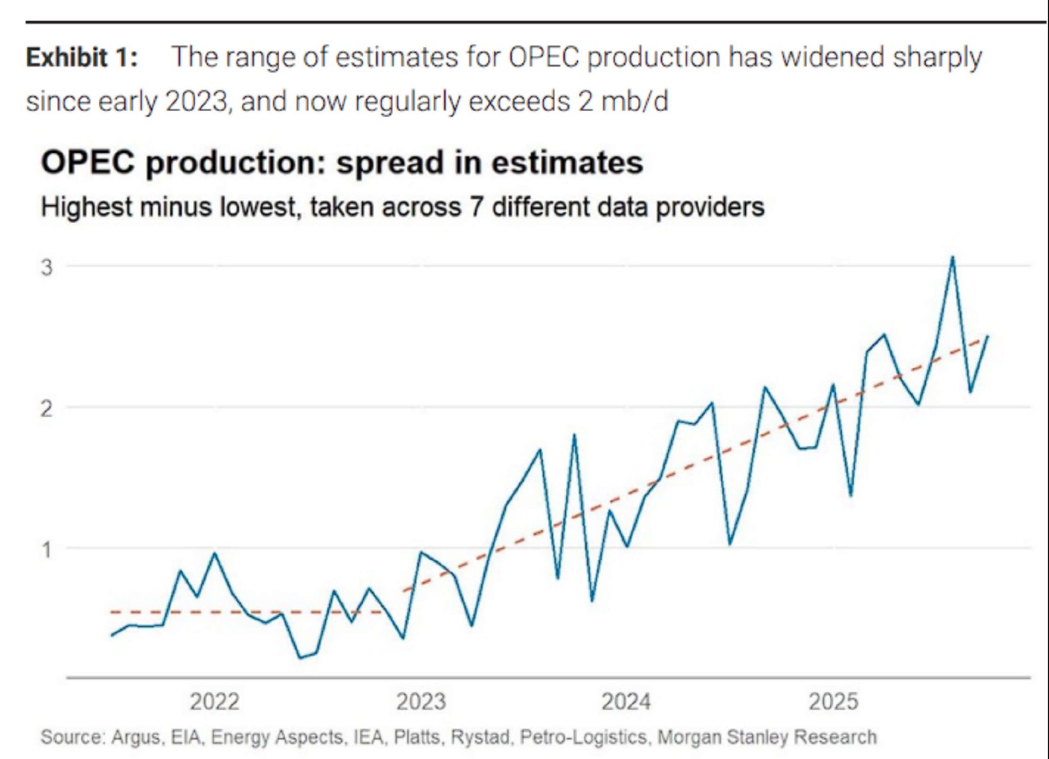 摩根士丹利追踪的六家专业数据提供商——Argus、美国能源信息署、EnergyAspects、国际能源署、Rystad和标普全球大宗商品——对OPEC原油产量的估算在2020-2022年期间误差仅为400-500千桶/日,但从2023年初开始出现分化,到2025年分歧已扩大至常态性超过1.5百万桶/日。