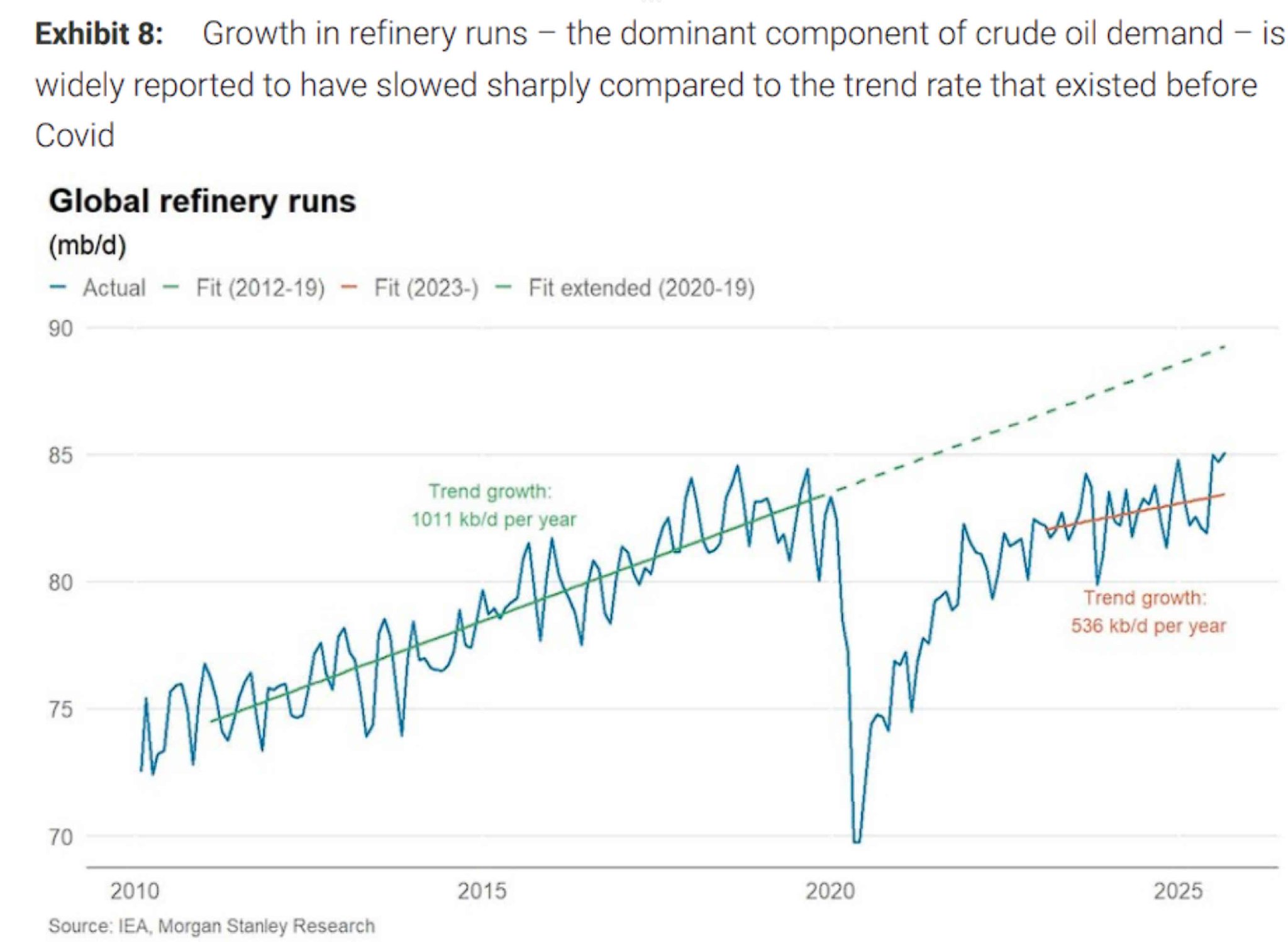 第二,全球炼厂开工率增长放缓异常。除了约每日100万桶的直接原油使用外,炼厂加工量构成了"原油需求"的绝大部分。数据显示,新冠疫情前的10年(以及更早的20-30年),炼厂开工率以每年约100万桶/日的稳定趋势增长。然而,自2023年初(正是OPEC产量估算开始分歧的时点)炼厂开工率的增长趋势大幅放缓至每年仅54万桶/日。