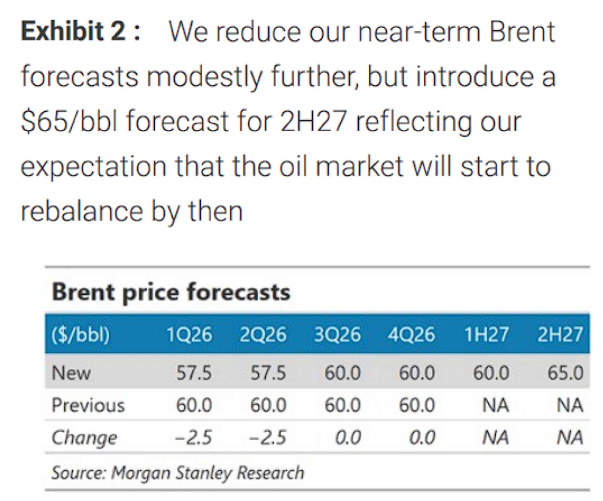 这种因素组合指向一个可能在2026年上半年非常大、但之后缓慢开始再平衡的供应过剩。大摩预计石油市场可能在2027年下半年前后重回平衡状态,并据此引入65美元/桶的布伦特原油价格预测。