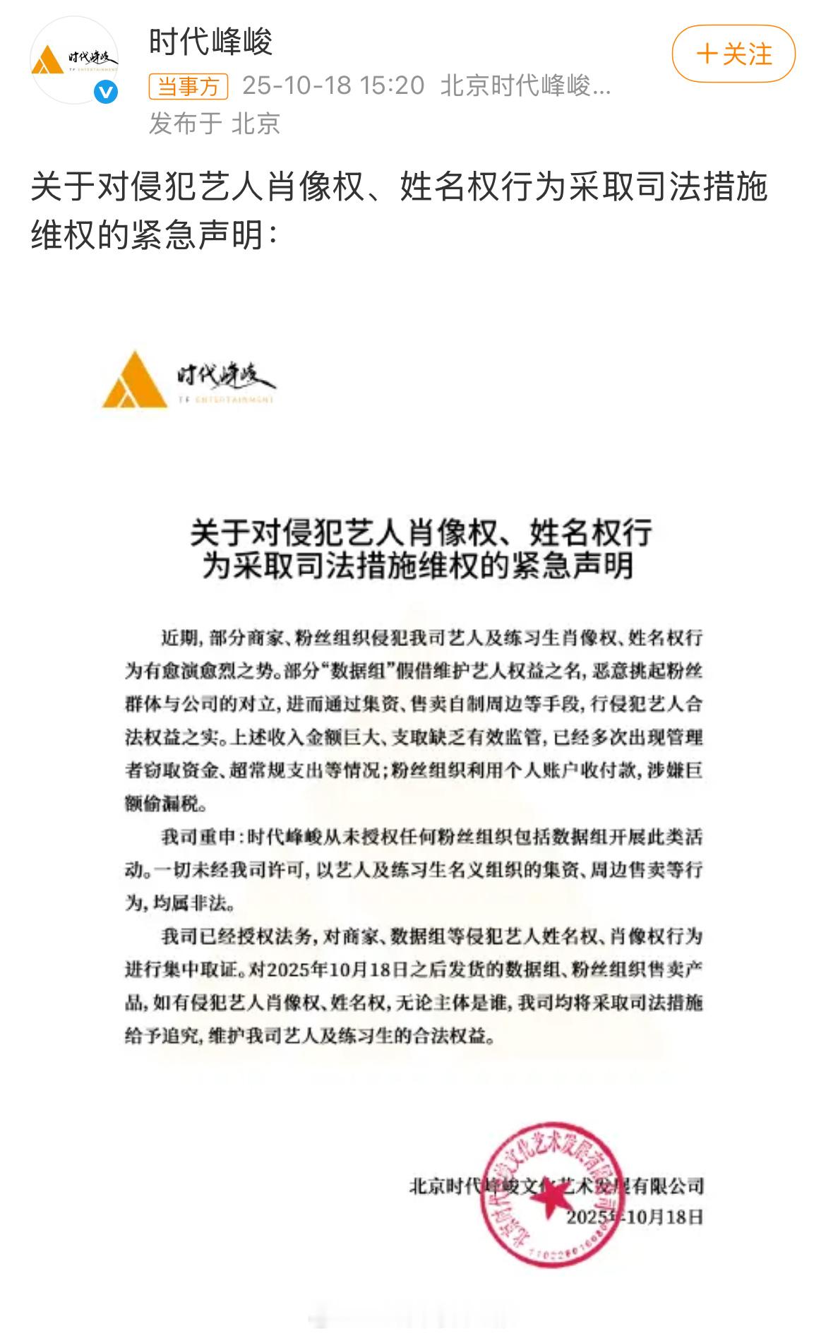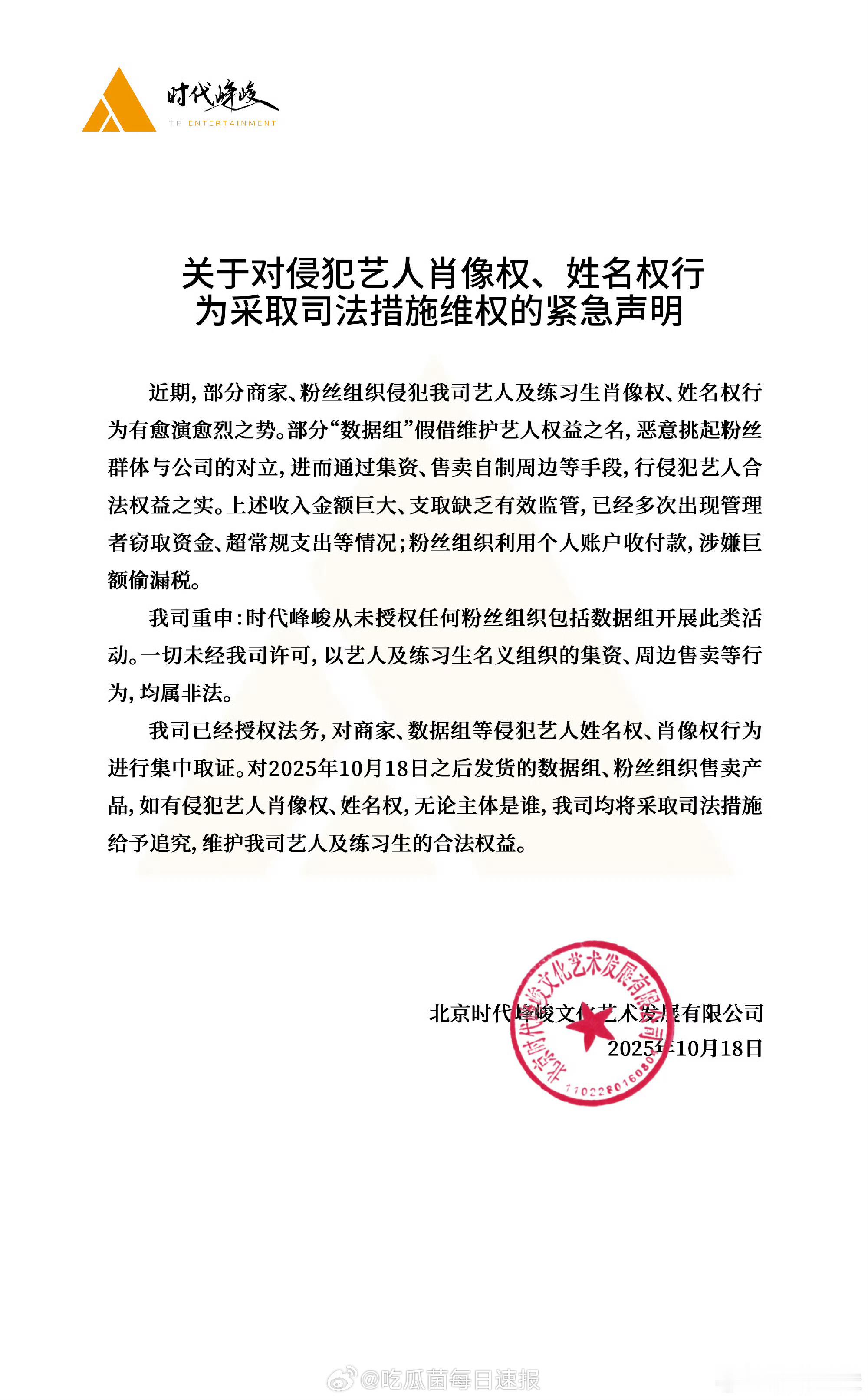 时代峰峻发布关于对侵犯艺人肖像权、姓名权行为采取司法措施维权的紧急声明,要告数据组了[哆啦A梦吃惊]