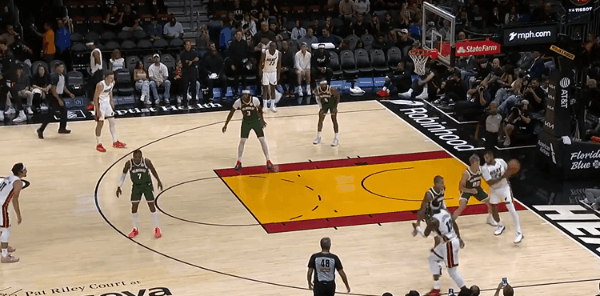 图5与上面给韦尔送空接的回合同理,借Pin Down向篮下卷切接球,吸引协防核心防守注意力后给顺下终结者送上空接打穿身后,这个回合波普想要直接换防阿德巴约破坏传球路线,但没有成功。