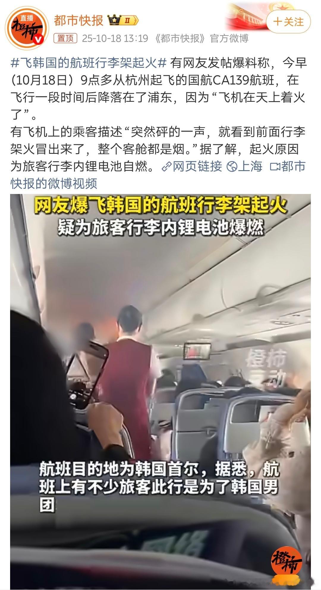 飞韩国的航班行李架起火