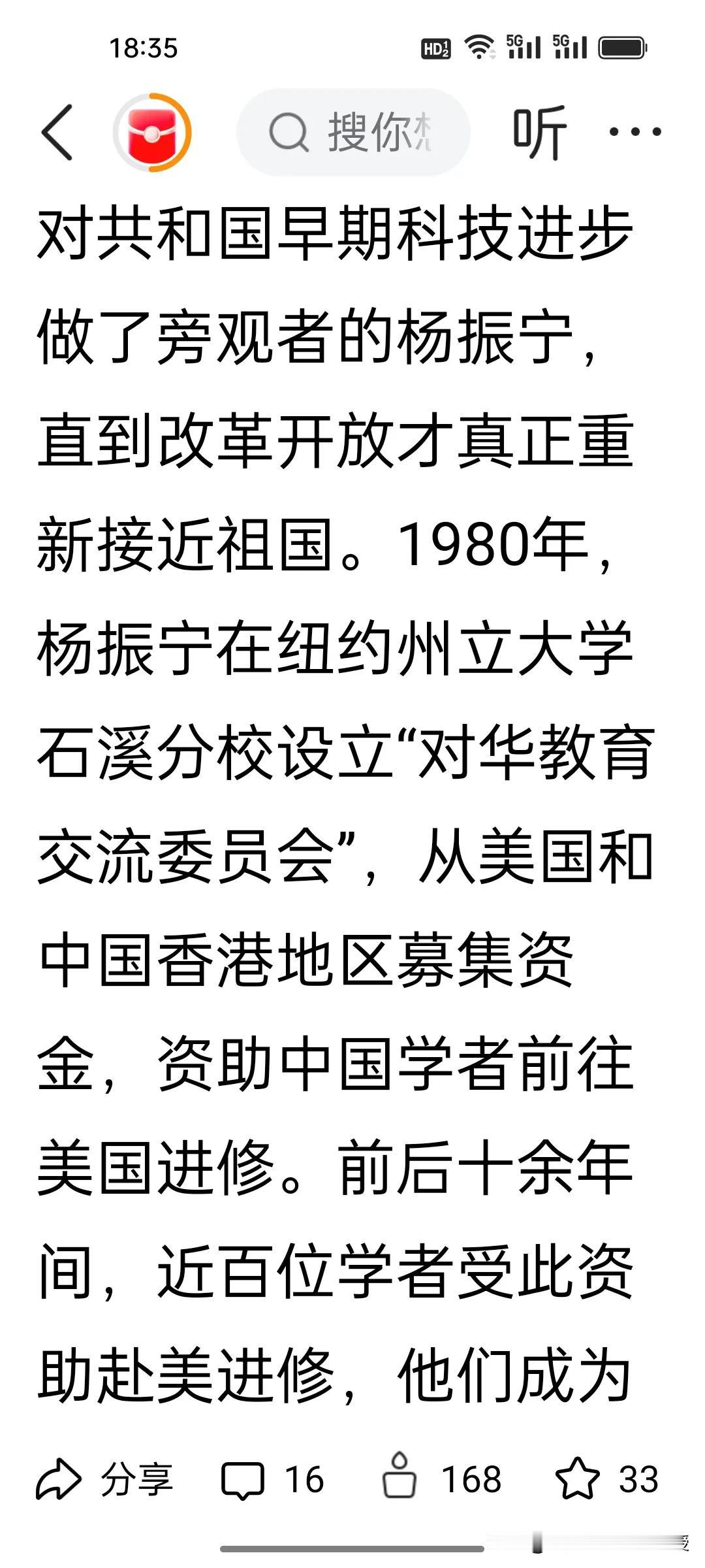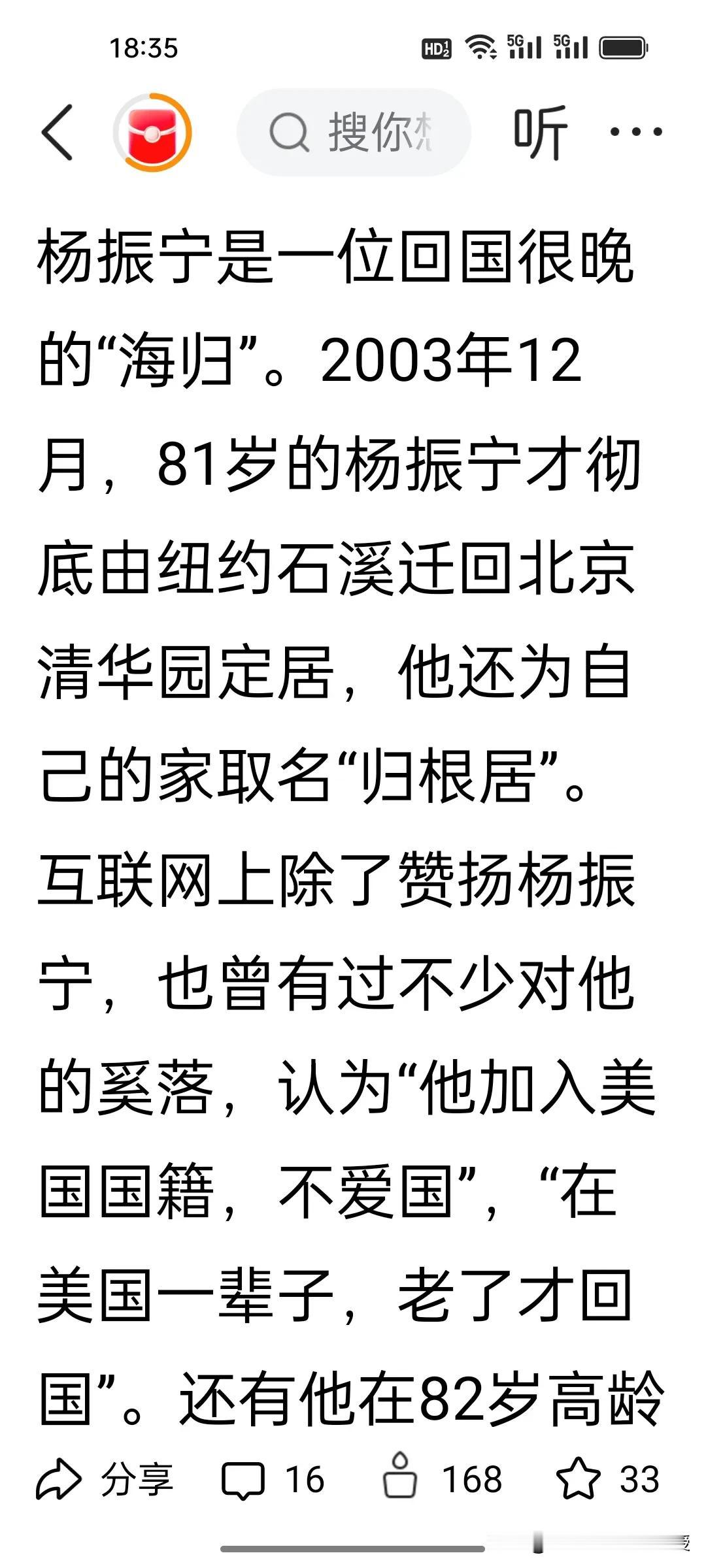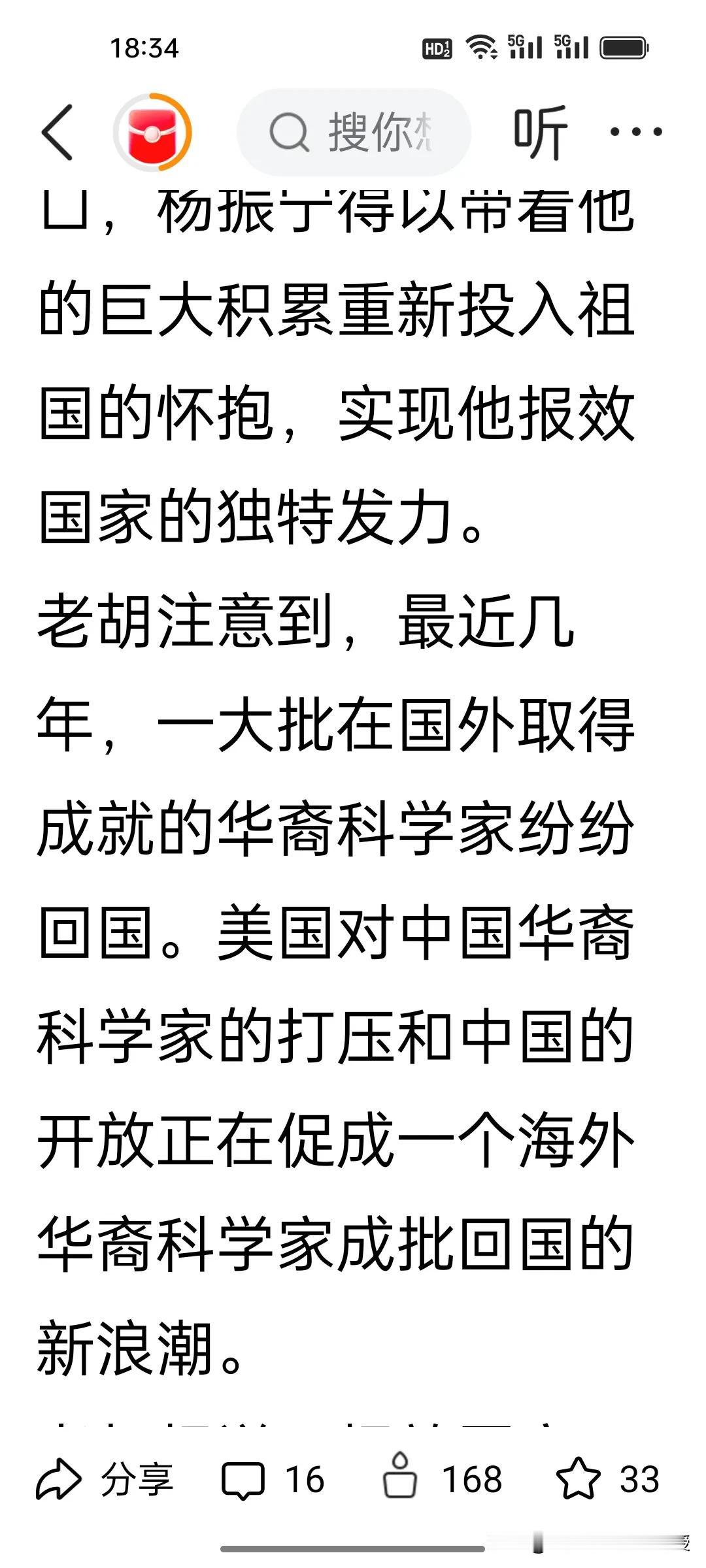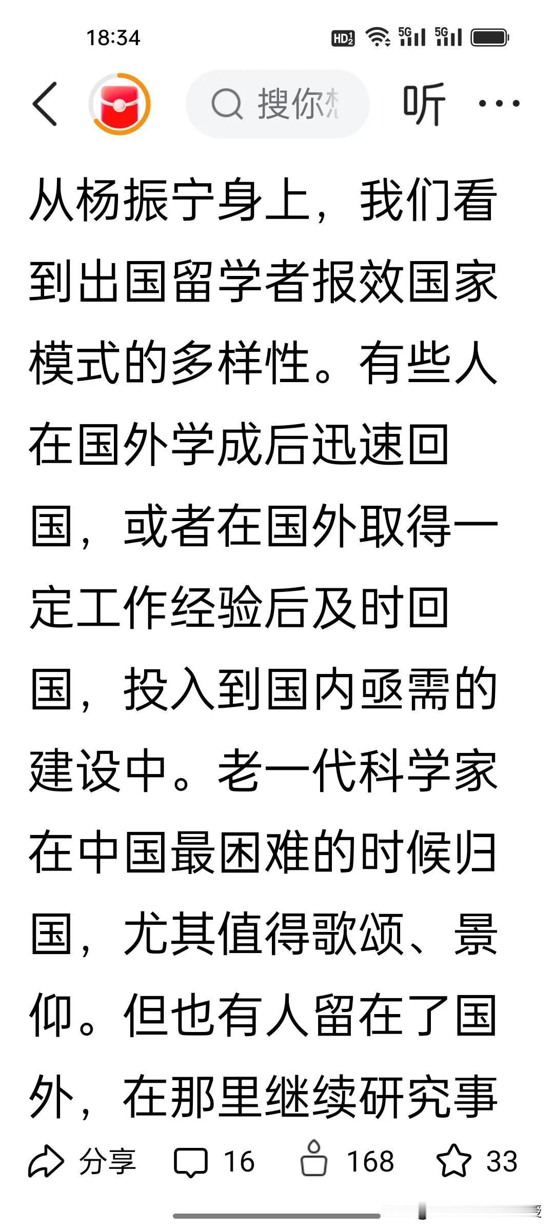刚刚看到胡锡进对于杨振宁先生评价的一句话,非常中肯。他认为杨先生推动了人类的科学进步,在中国改革开放后的高校理工科建设上做出了重要贡献。胡锡进鼓励早报效国家,但也无须抱怨晚者。 现在越来越多的华人科学家选择回国报效祖国,今年有刘畅(核物理学家),林华新(数学家),胡晔(生物医药学家),齐国君(AI专家)等等都选择从生活了几十年的美国回来,在中国高校继续发光发热。 今年这股归国热潮的背后,正是以杨振宁先生为代表的前辈们用一生搭建桥梁、播撒火种的深远影响,他以卓越科学成就与赤诚家国之心,成为了跨越时代的精神灯塔。