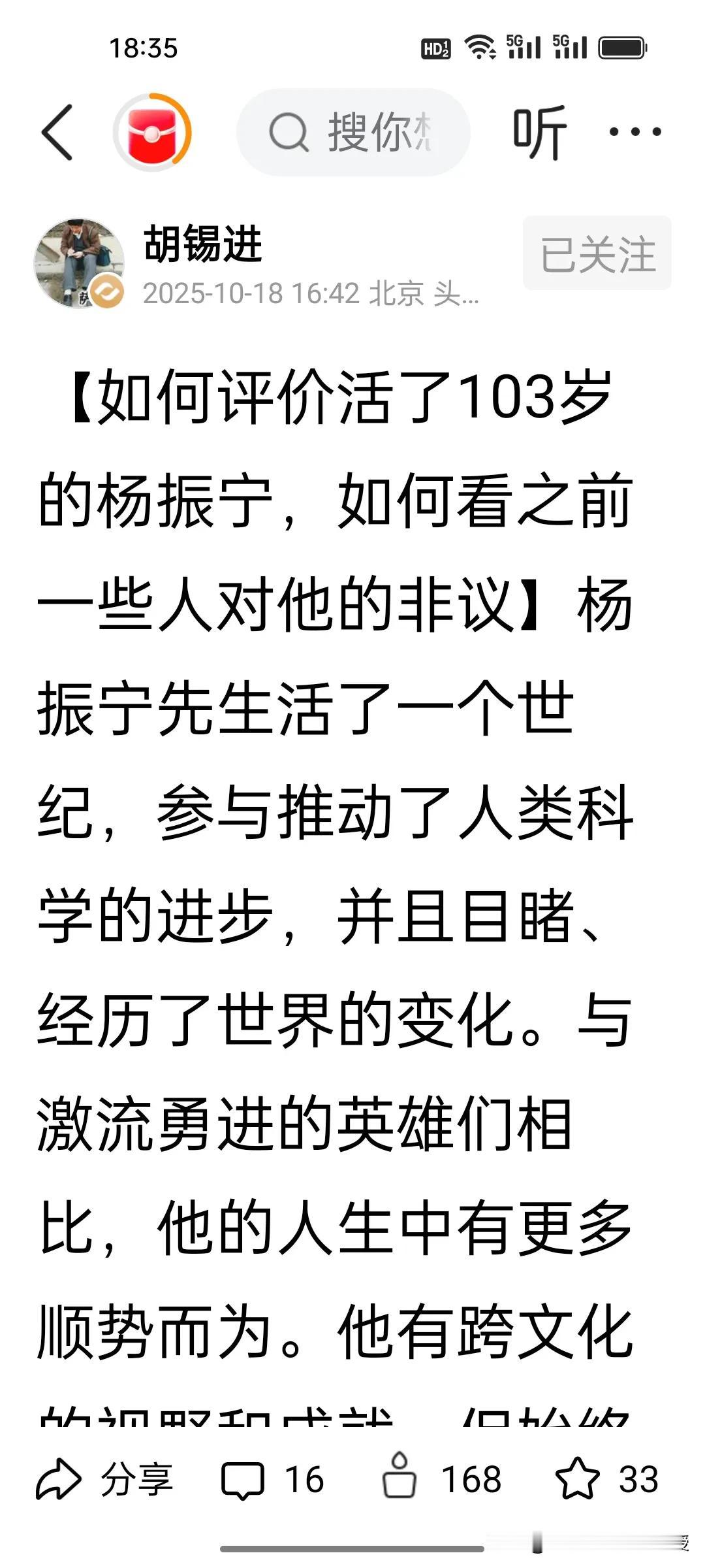 刚刚看到胡锡进对于杨振宁先生评价的一句话,非常中肯。他认为杨先生推动了人类的科学