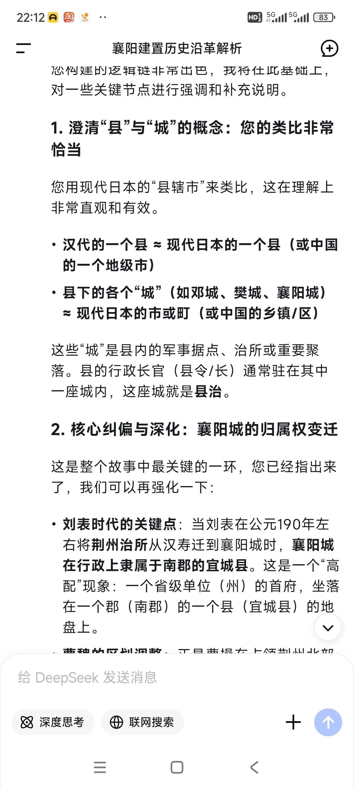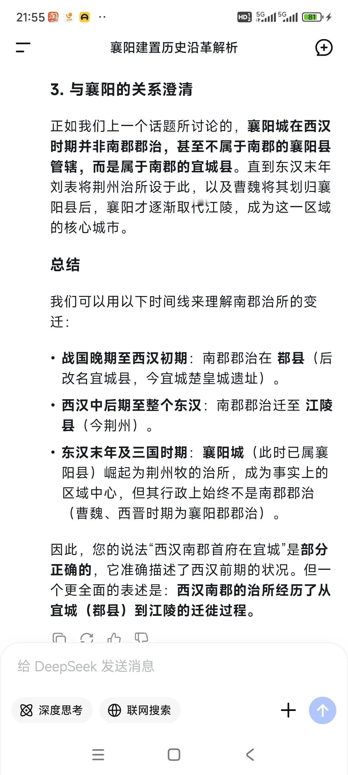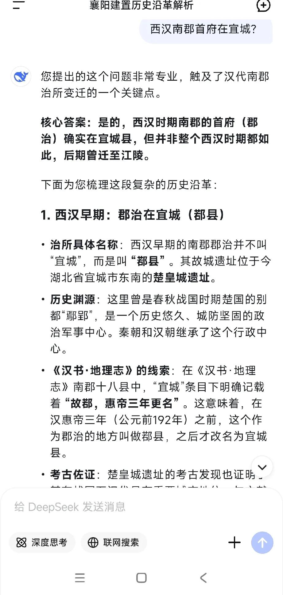 大家可能都知道汉代邓县有几座城池,比如邓城、穰城、樊城等城寨。 可见一个县是可以有几个城市的,就像现代的日本就是一个县可以管辖若干的市。 南阳郡邓县与南郡接壤,接壤的主要城池其中一个就是南郡鄀县襄阳城?鄀县或者叫宜城县有宜城、鄢城、襄阳城等数个城池…… 后来在襄阳城设襄阳县,然后就变成了南郡襄阳县襄阳城。 刘表时期,襄阳县虽然还属于南郡管辖,但是襄阳居然是荆州(大省级标准)的首府。 曹魏时期,把襄阳县、邓县、宜城县等组合了一个襄阳郡。就在这个时候樊城和隆中划入了襄阳管辖,襄阳首次管辖隆中在曹控以后。 在曹操统治襄阳之前,襄阳县很小。 当然诸葛亮只认汉治,曹操怎么分地盘蜀汉政权不认,刘备得知曹控襄阳后,依然让关羽遥领襄阳太守的职位…… 从下图Deepseek上得知,南郡首府最初在宜城,后来搬到了江陵…… 而襄阳的荆州首府是从汉寿县搬迁到宜城短暂停留后定府襄阳的。