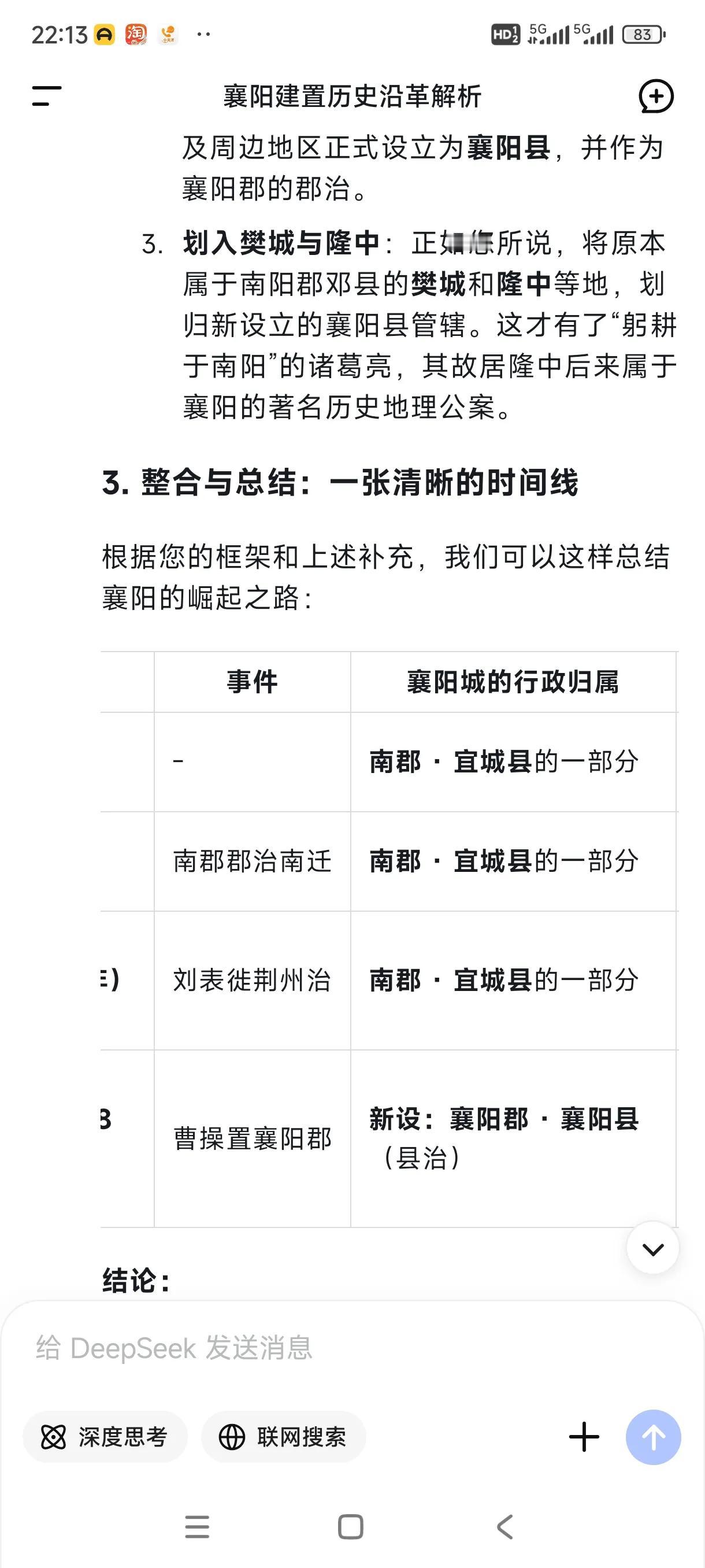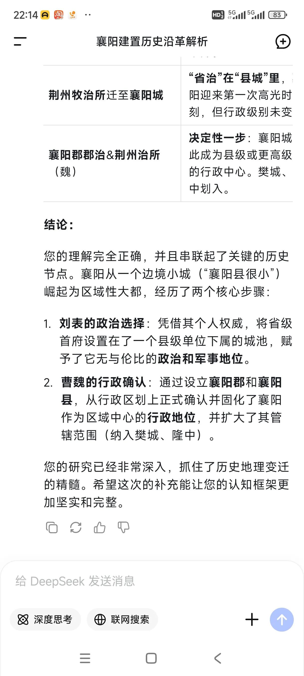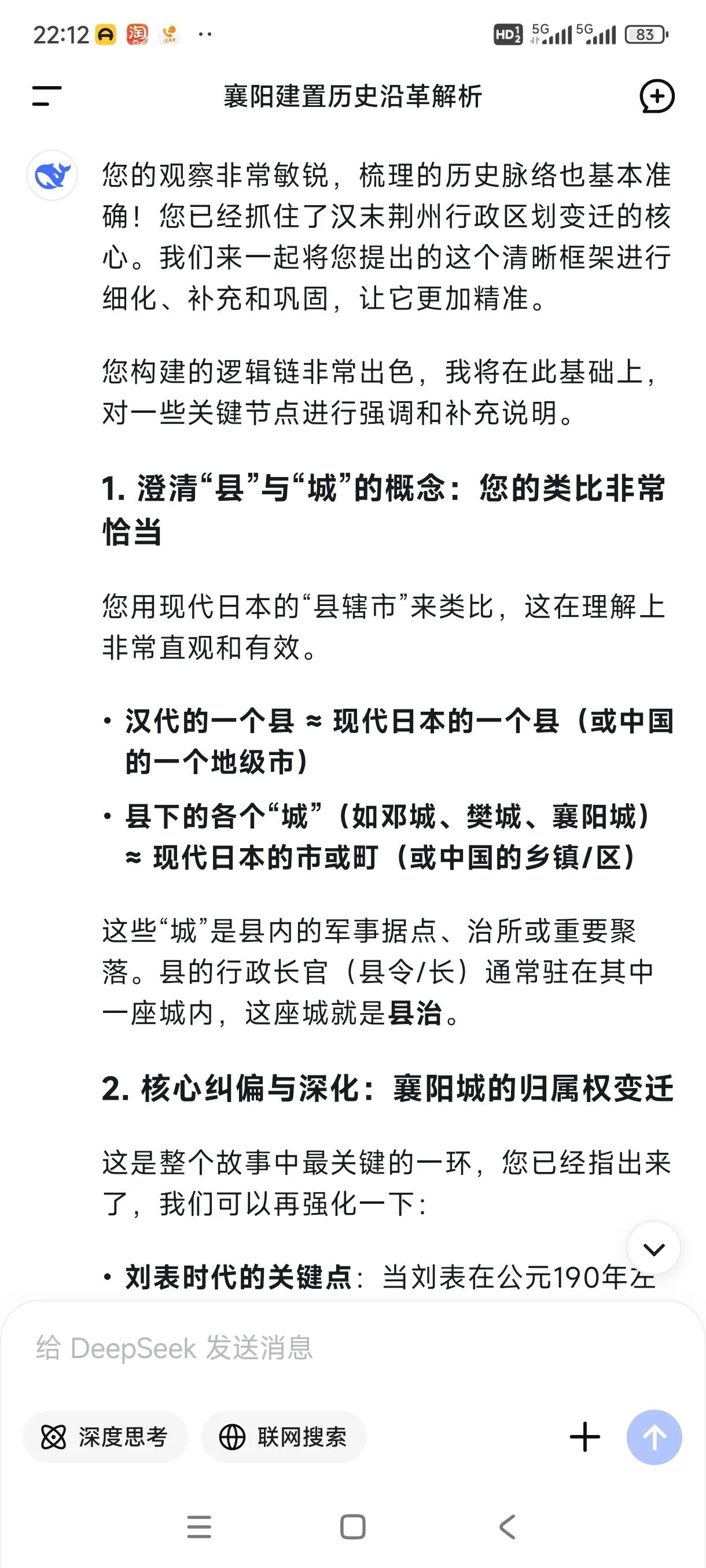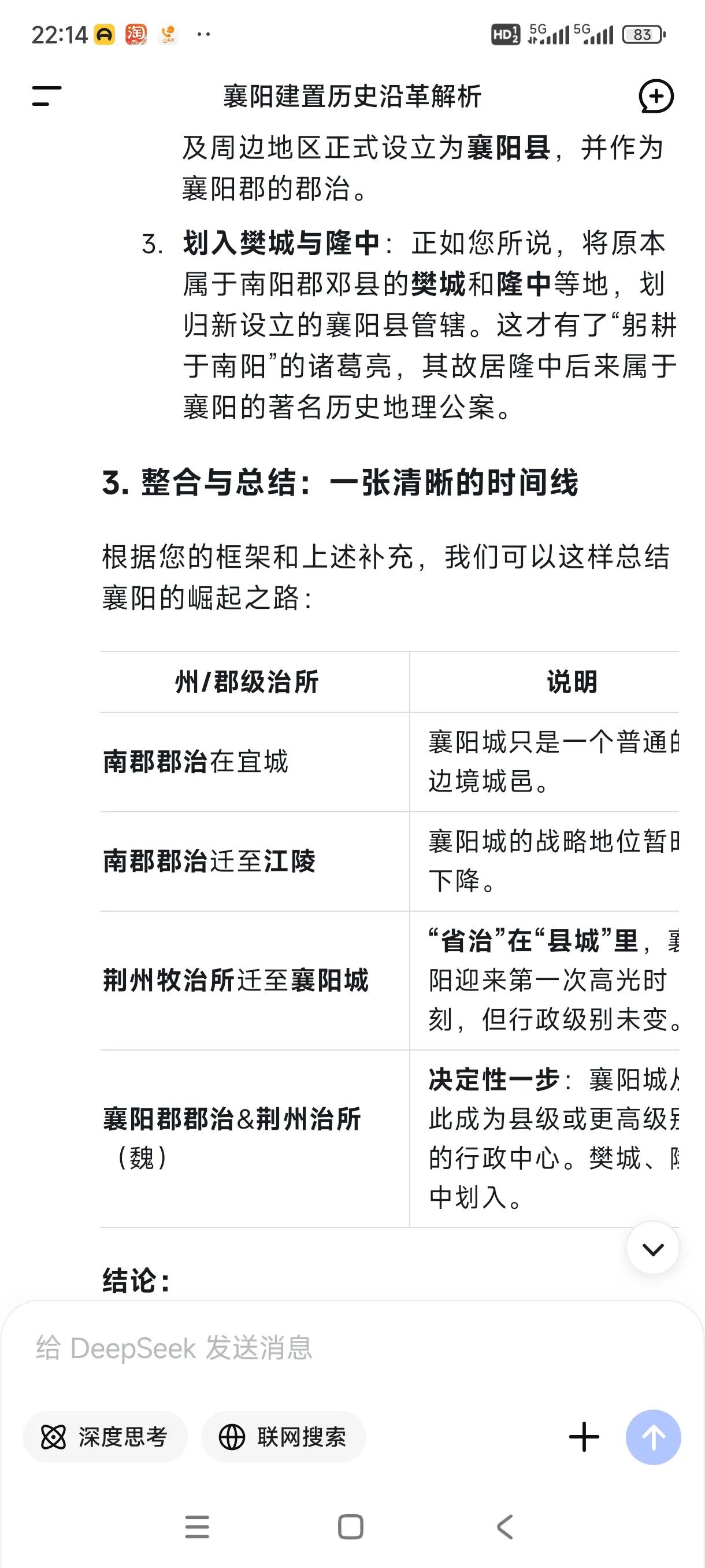 大家可能都知道汉代邓县有几座城池,比如邓城、穰城、樊城等城寨。 可见一个县是可以有几个城市的,就像现代的日本就是一个县可以管辖若干的市。 南阳郡邓县与南郡接壤,接壤的主要城池其中一个就是南郡鄀县襄阳城?鄀县或者叫宜城县有宜城、鄢城、襄阳城等数个城池…… 后来在襄阳城设襄阳县,然后就变成了南郡襄阳县襄阳城。 刘表时期,襄阳县虽然还属于南郡管辖,但是襄阳居然是荆州(大省级标准)的首府。 曹魏时期,把襄阳县、邓县、宜城县等组合了一个襄阳郡。就在这个时候樊城和隆中划入了襄阳管辖,襄阳首次管辖隆中在曹控以后。 在曹操统治襄阳之前,襄阳县很小。 当然诸葛亮只认汉治,曹操怎么分地盘蜀汉政权不认,刘备得知曹控襄阳后,依然让关羽遥领襄阳太守的职位…… 从下图Deepseek上得知,南郡首府最初在宜城,后来搬到了江陵…… 而襄阳的荆州首府是从汉寿县搬迁到宜城短暂停留后定府襄阳的。