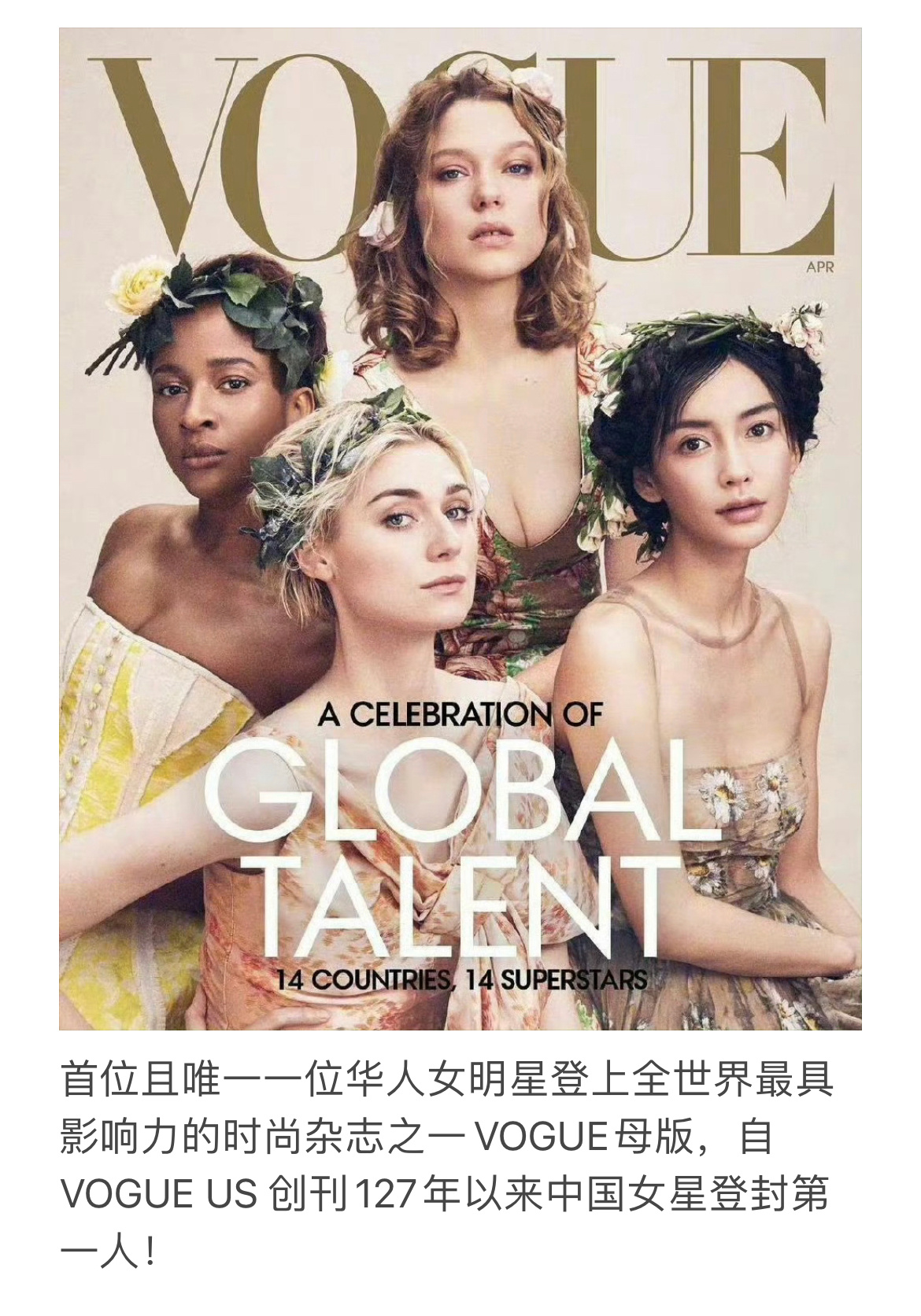 首位且唯一一位华人女明星登上全世界最具影响力的时尚杂志之一VOGUE母版,自VOGUE US 创刊127年以来中国女星登封第一人!