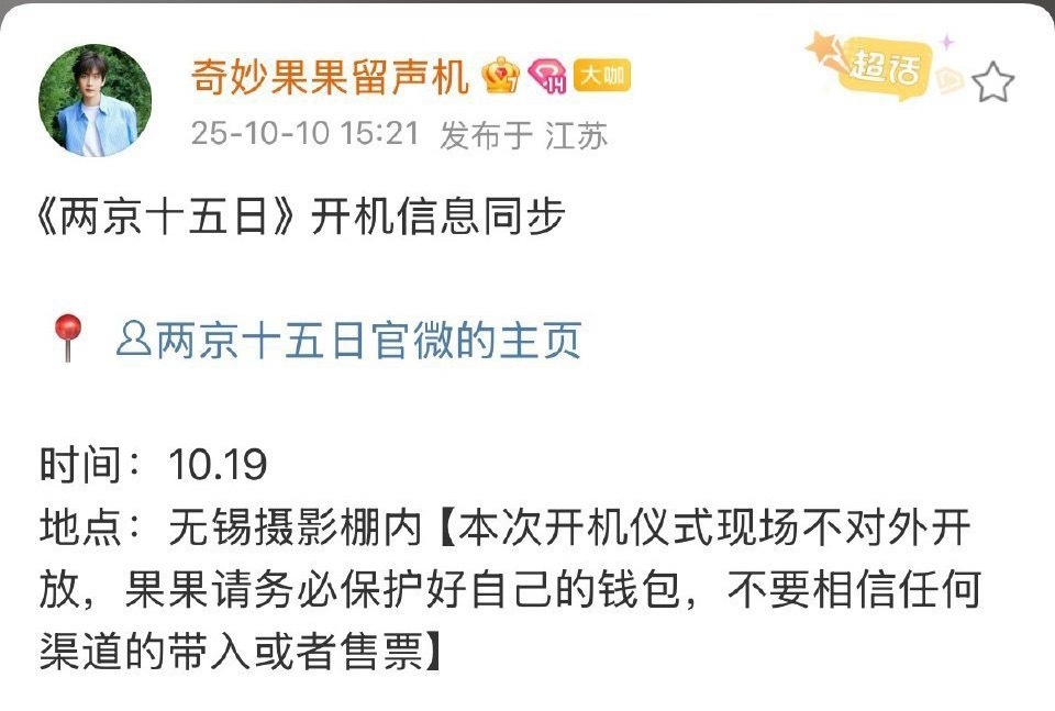 两京十五日开机物料成毅两京十五日物料发布节奏