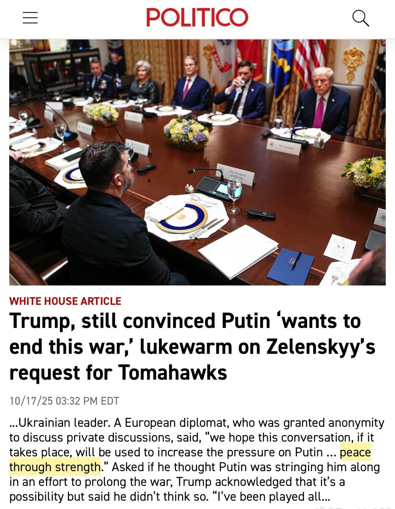 Politico 援引一位歐洲外交官的話寫道:川普與普京在布達佩斯會晤期間,歐洲希望「以實力求和平」。 「我們希望這次談話能夠對普京施加更大壓力……以實力求和平。」