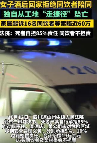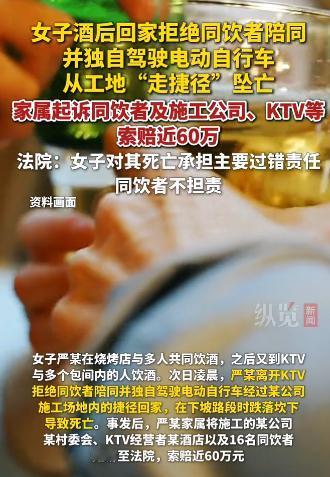 四川凉山,女子到烧烤店喝了酒后,又跑到KTV继续喝,喝到凌晨,酩酊大醉,朋友们说送她回家,女子坚决拒绝,骑着电瓶车独自抄近路回去,期间经过某公司施工场地,谁料,下坡时没注意坡坎跌落身亡,事后,家属把某公司、某村委会、KTV经营者和同饮者告上法庭,索赔60万,最终法院这么判。 近日,四川凉山州中级人民法院对女子严某酒后坠亡一案作出终审判决,引发热议。 事情要从2023年1月8日说起,那天下午,严某约了石某、张某等几个朋友,在当地一家烧烤店喝酒聊天。 酒过三巡,晚上9点多,因为没有尽兴,她又转场到某酒店经营的KTV。 但在KTV里,严某没闲着,又跟好几个包间的熟人碰了杯,几人因为开心,酒局一直延续到次日凌晨。 终于有人扛不住了,于是便提出了散场,几人三三两两的走出房间,还一直在说说笑笑。 走到门口,凌晨的凉山街头还带着寒意,严某带着酒意跨上电动自行车准备回家。 同饮者见她喝得不少,便提出送她回去,却被严某摆着手拒绝了,她说自己能行。 因为几人喝的也不少,便也没有多加劝阻,便各自回家。 但没想到,就是这一别,却成为了事件的导火索。 为了省点时间,严某没走常规路线,反而拐进了一家公司的施工场地,因为她听说从这儿穿过去是条捷径。 可她没注意,这段下坡路不仅陡峭,还连一块警示标志都没有,更别提防护围栏了。 一阵颠簸后,严某连人带车从坎上摔了下去,再也没能醒来。 事发三天后,当地村委会和涉事施工公司一起凑了5万元,用于严某的安葬事宜。 但这笔出于人道主义的垫付,没能平息家属的悲痛。 他们觉得,多个主体都对严某的死亡负有责任,于是将16名同饮者、KTV经营者某酒店、施工公司以及当地村委会一并告上法庭,索赔总额近60万元。 家属的起诉把四个主体都推上了被告席,但法院审理后,逐一厘清了各方的责任边界。 最受关注的是16名同饮者,家属觉得“一起喝了酒就得担责”,但法院查遍了证据,没找到任何人劝严某喝酒、逼她干杯的痕迹。 反而有证据显示,散场时有人主动提出陪同,是严某自己拒绝了。 最终,凉山法院也认定,同饮者没有过错,不用承担赔偿责任。 KTV一方一开始觉得很冤枉,辩称严某是在KTV外出的事,跟他们没关系。 但法院并不认可这个说法,认为严某坠亡的路段紧挨着KTV,是不少消费者散场后会走的路,而且路段有坡坎,本身就有风险。 根据《民法典》第一千一百九十八条,娱乐场所经营者对消费者负有安全保障义务,保障这段路的安全属于合理范围,没做到就得担责。 而施工公司的责任更明确,作为场地管理者,他们对施工区域的危险视而不见,既不设警示标志,也不装防护围栏,完全没尽到安全管理义务。 一审判决其承担10%责任后,施工公司不服上诉,可二审法院认为一审事实清楚、适用法律正确,最终驳回上诉维持原判。 至于村委会,交警部门早就出具了事故认定,严某对这起坠亡事故负全部责任。 虽然村委会垫了安葬费,但这只是人道主义援助,不能等同于法律上的责任,所以法院也判了村委会无责。 法院最终核定,这起案件的总赔偿金额为1277693元。 严某自己承担85%的主要责任,KTV需赔偿5%,扣除已付的25000元,还需再付38885元。 施工公司赔偿10%,扣除已付款后需再付102769元,两者合计赔付19万余元。 这起案件撕开了酒文化里的一个误区,好像“一起喝酒”就等于“绑定责任”,但法律的判定从来只看“过错”。 共饮人有过错要担责,无过错不担责,不能把责任无限放大。 以前总有人担心“喝酒出事就赖同桌”,但凉山这起判决和多地案例都说明,只要同饮者没劝酒、尽到了提醒义务,就不用当“背锅侠”。 反过来说,这起悲剧更该提醒成年人:自己才是安全的第一责任人。 酒是自己喝的,路是自己选的,拒绝陪同也是自己做的决定,没人能为你的任性兜底。 而公共场所的经营者和管理者更要明白,安全保障义务不是空话,一块警示牌、一道围栏,或许就能避免一场悲剧。 信息来源:红星新闻2025-10-16发布:女子酒后从工地“走捷径”坠亡,家属起诉同饮者及施工公司、KTV等索赔近60万 法院判了
