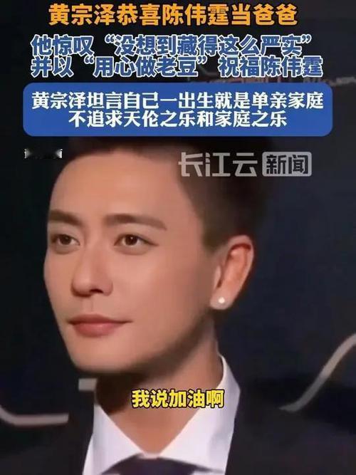 黄宗泽秒送祝福,调侃陈伟霆藏太深 陈伟霆官宣生子后,黄宗泽出席活动时透露,自己看新闻才知情,当即发消息恭喜[__LINK_ICON]。他调侃对方“藏得太深”,还叮嘱“用心做老豆(老爸)”。 两人因2014年电影《男人不可以穷》饰演兄弟结缘,此次祝福被网友视作角色情谊的延续,更戏称“电影照进现实”。陈伟霆 陈伟霆演技
