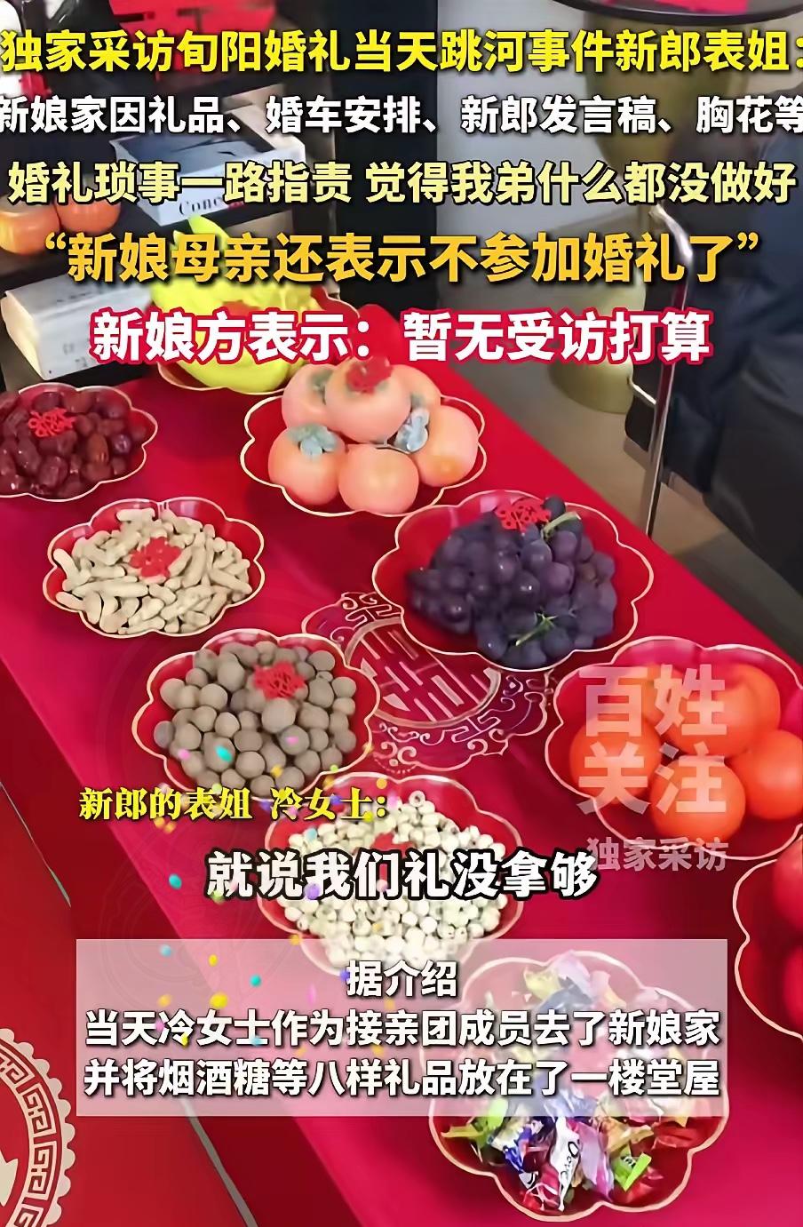 终于理解陕西跳河的新郎了,摊上这样的丈母娘家,搁谁不死也得疯!下辈子洒脱点,别这么委屈自己了! 婚礼当天一大早,丈母娘的连环call就没停过,指着鼻子说8样礼只收到4样,可新郎明明备齐了,到底是中途丢了还是故意找茬,谁也说不清楚。 紧接着又翻旧账,婚车没准时到、胸花戴得不对、发言稿没提前过目,桩桩件件都成了指责的理由,新郎有口难辩,本来该喜气洋洋的人,愣是愁得脸皱成一团。 最绝的是最后那句“我不去了,你今天别想在婚礼上见到我”,这话一撂,直接把新郎架在火上烤。 要是早看不上女婿,当初就该说清楚,犯不着等到结婚当天来刁难; 要是心里认可,就算有疏漏,等婚礼结束慢慢说不行吗? 婚礼本是为了见证幸福,不是用来挑刺逼人的,把人逼到绝路,这样的“场面”谁看了不窒息? 你们觉得婚礼上遇到这种突发刁难,是该当场较真,还是先顾全大局事后再说?