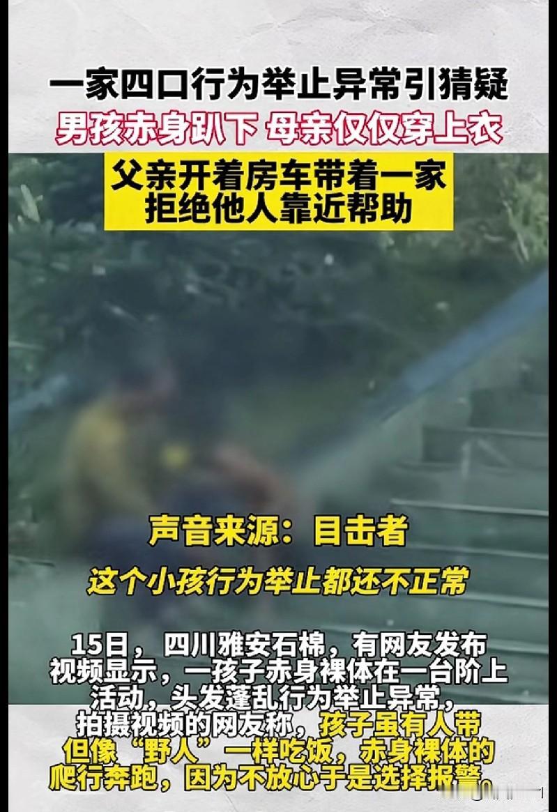 “家人们快看这事儿多离谱!四川雅安一家四口行为怪异,男孩赤身裸体爬行,妈妈就穿个上衣,爸爸开着房车带着全家,还拒绝别人帮忙。目击者说这孩子行为不正常,跟‘野人’似的吃饭、爬行奔跑,网友不放心就报警了。 这到底是啥情况啊?好好的孩子咋养成这样了?评论区都炸了,有人担心‘这孩子以后可咋办’,有人疑惑‘这家人是不是有啥隐情’。 咱就说,孩子成长多重要啊,这样下去不是耽误孩子吗?希望警察介入后能好好查查,给孩子一个正常的生活。你们觉得这事儿怪不怪?快来说说你的看法!”